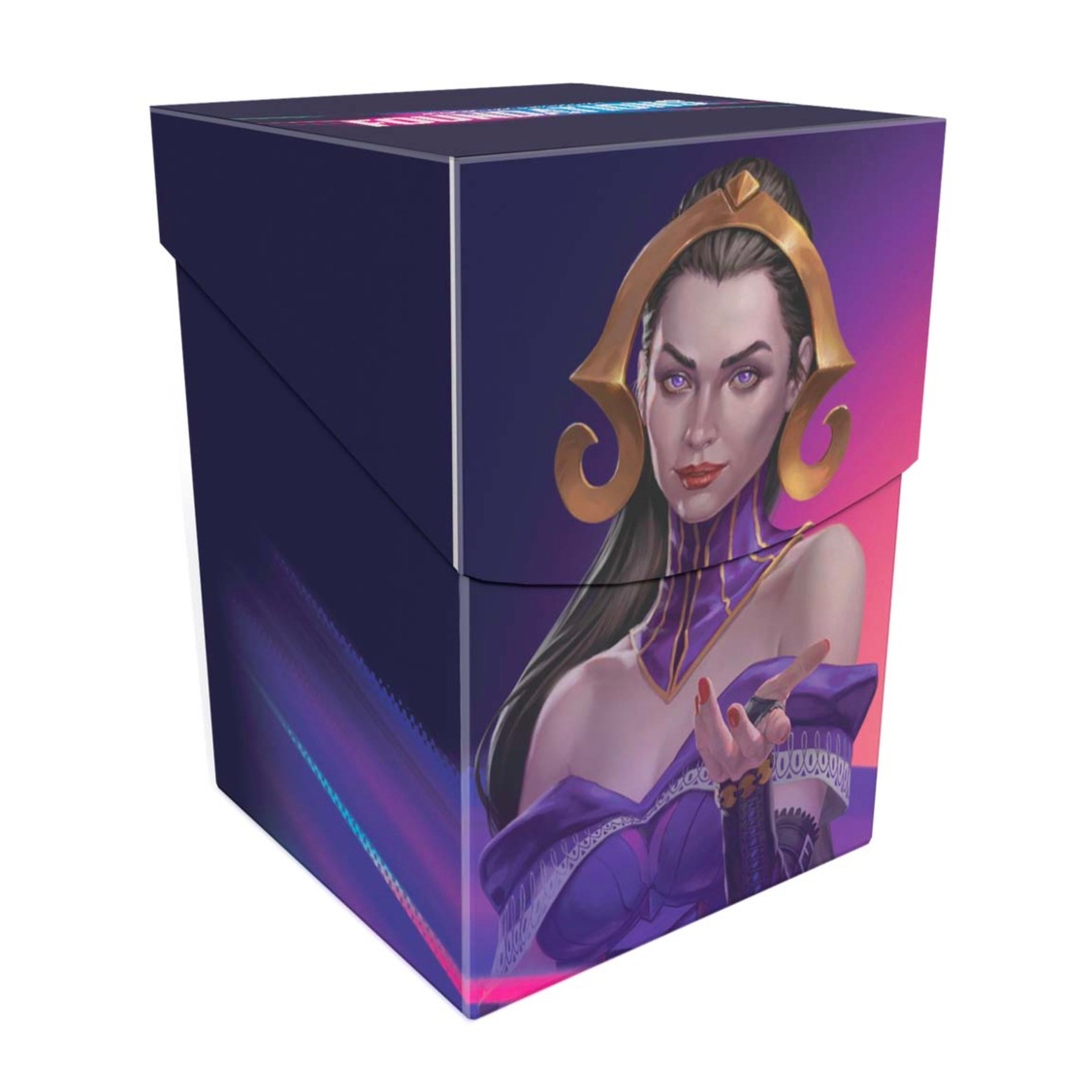 The 100+ Deck Box® card storage container features vibrant, full-color artwork from Magic: The Gathering and includes one deck divider. Made with archival-safe, non-PVC, rigid polypropylene materials, you can store up to 100 double-sleeved cards with confidence. The self-locking lid keeps your cards securely stored when not in use, while also offering easy access. Sized for standard-size trading cards.