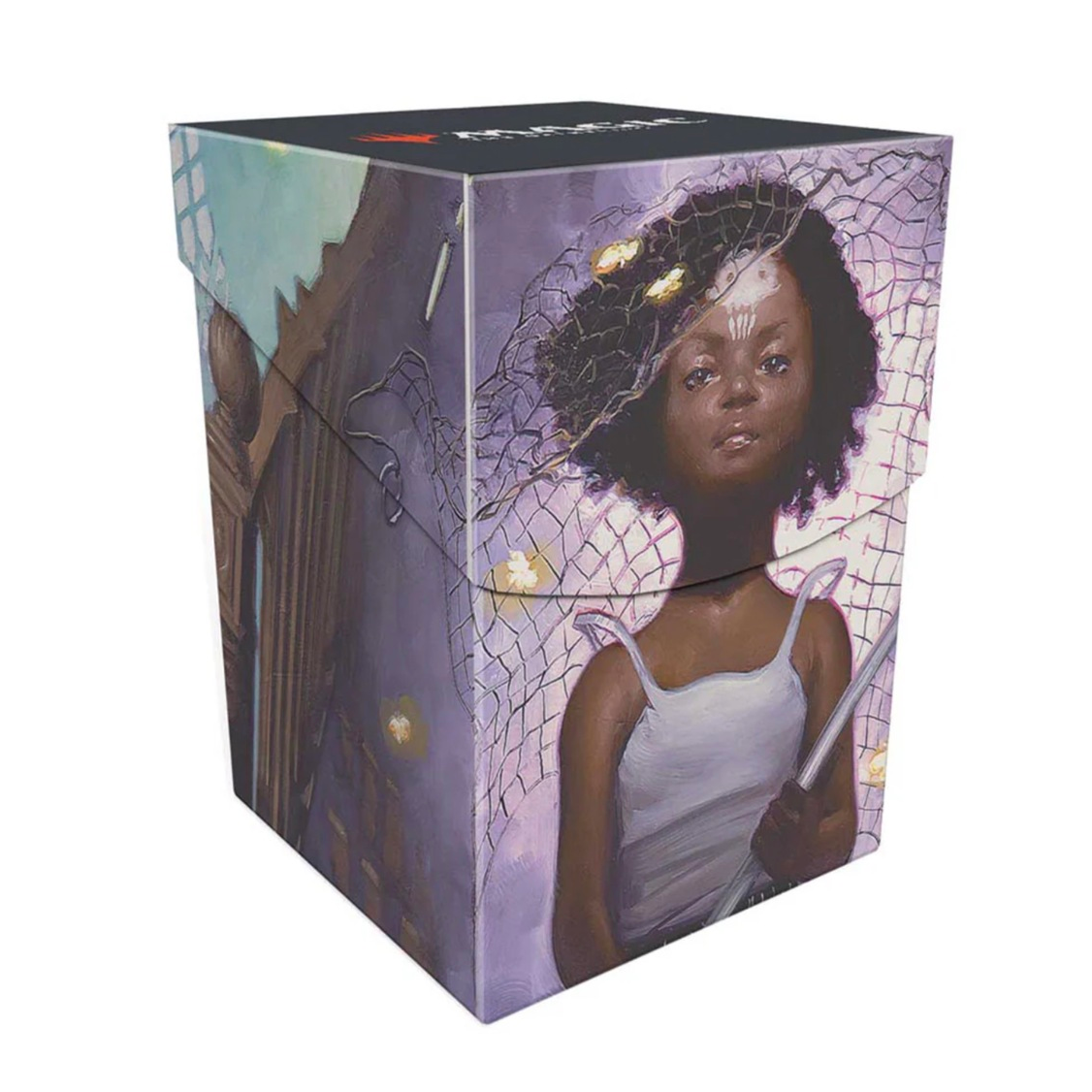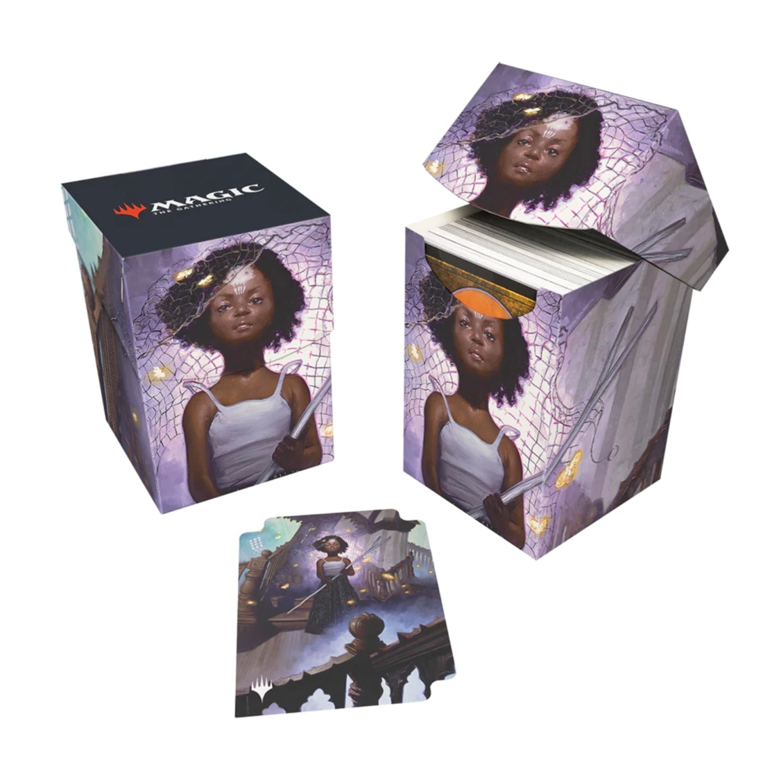 The 100+ Deck Box® card storage container features vibrant, full-color artwork from Magic: The Gathering and includes one deck divider. Made with archival-safe, non-PVC, rigid polypropylene materials, you can store up to 100 double-sleeved cards with confidence. The self-locking lid keeps your cards securely stored when not in use, while also offering easy access. Sized for standard-size trading cards.