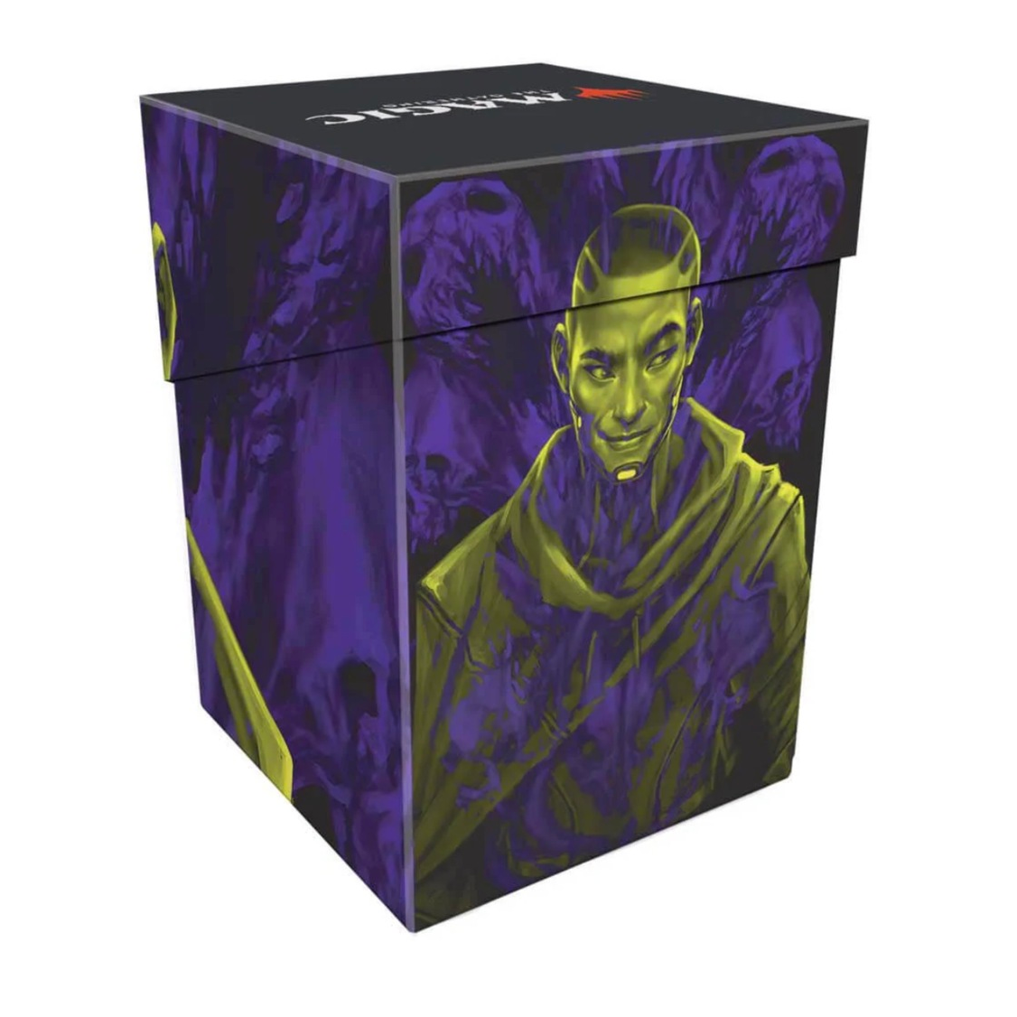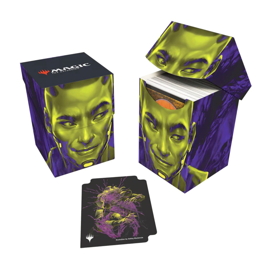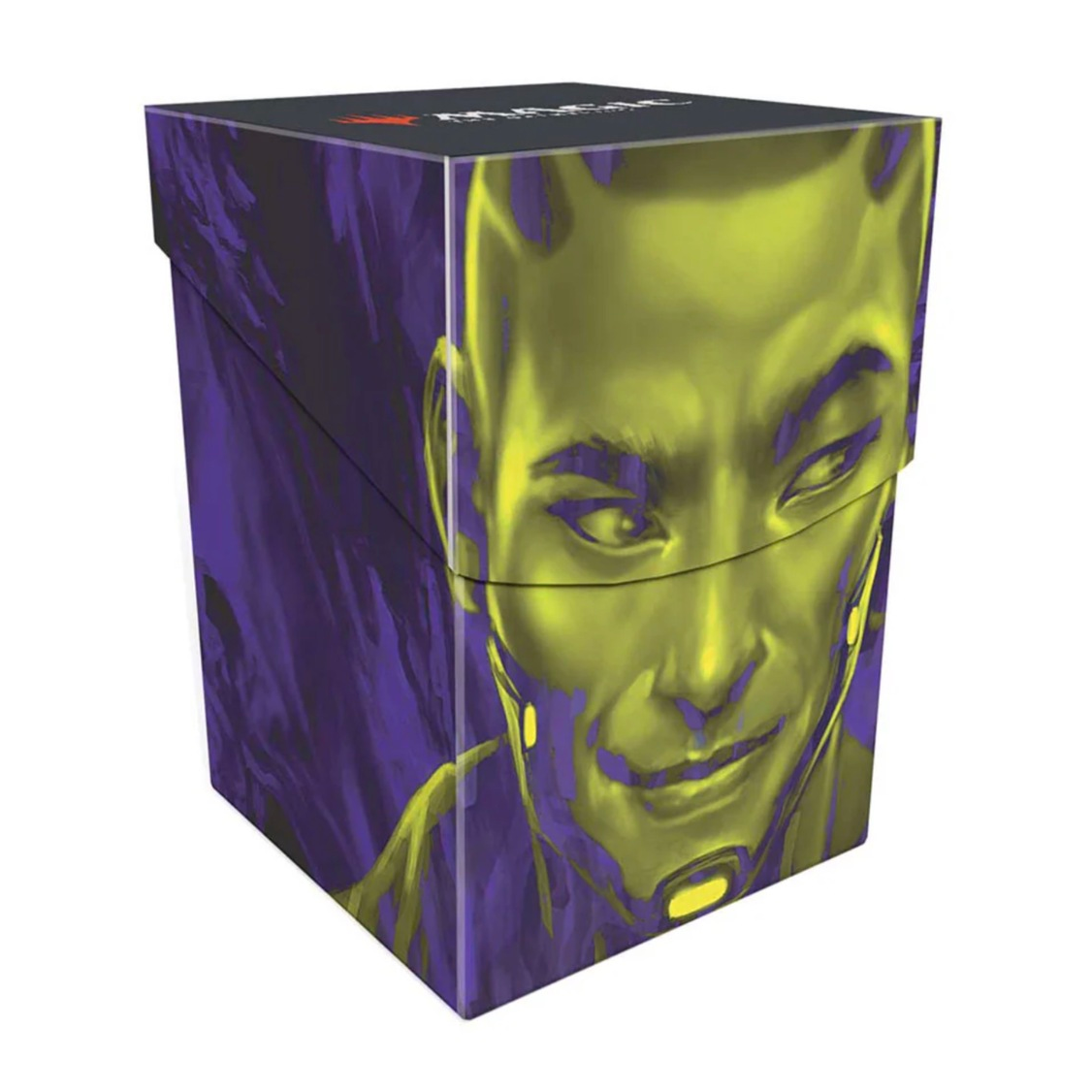 The 100+ Deck Box® card storage container features vibrant, full-color artwork from Magic: The Gathering and includes one deck divider. Made with archival-safe, non-PVC, rigid polypropylene materials, you can store up to 100 double-sleeved cards with confidence. The self-locking lid keeps your cards securely stored when not in use, while also offering easy access. Sized for standard-size trading cards.
