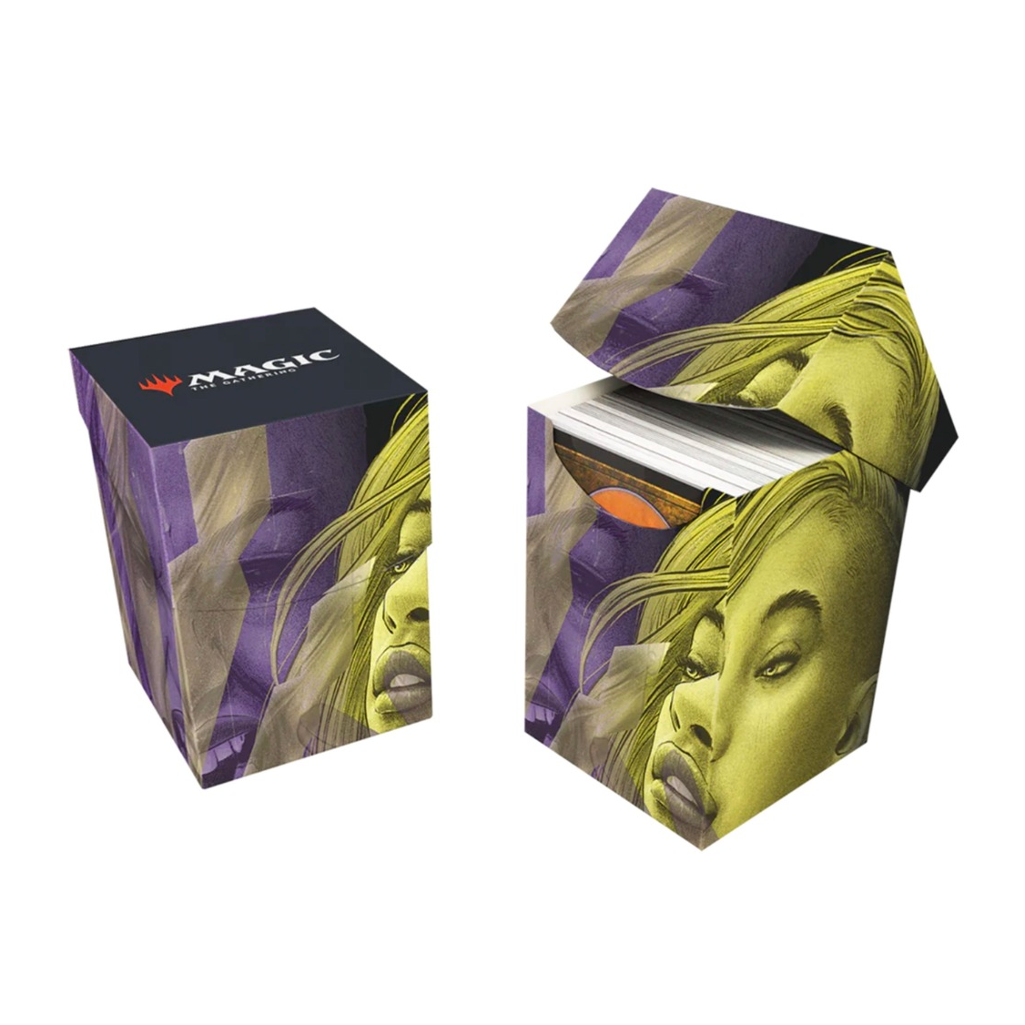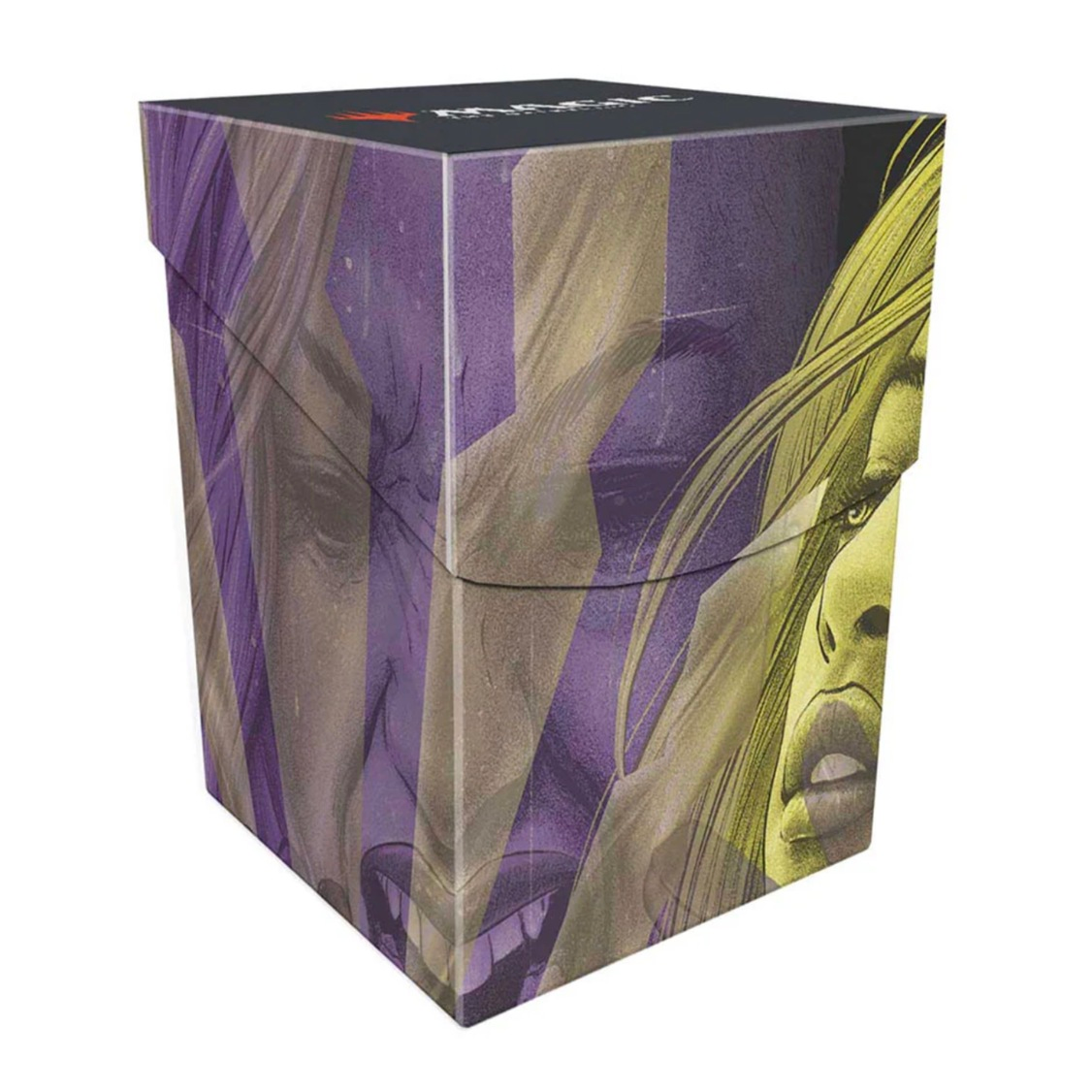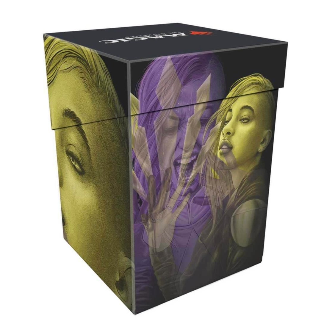 The 100+ Deck Box® card storage container features vibrant, full-color artwork from Magic: The Gathering and includes one deck divider. Made with archival-safe, non-PVC, rigid polypropylene materials, you can store up to 100 double-sleeved cards with confidence. The self-locking lid keeps your cards securely stored when not in use, while also offering easy access. Sized for standard-size trading cards.