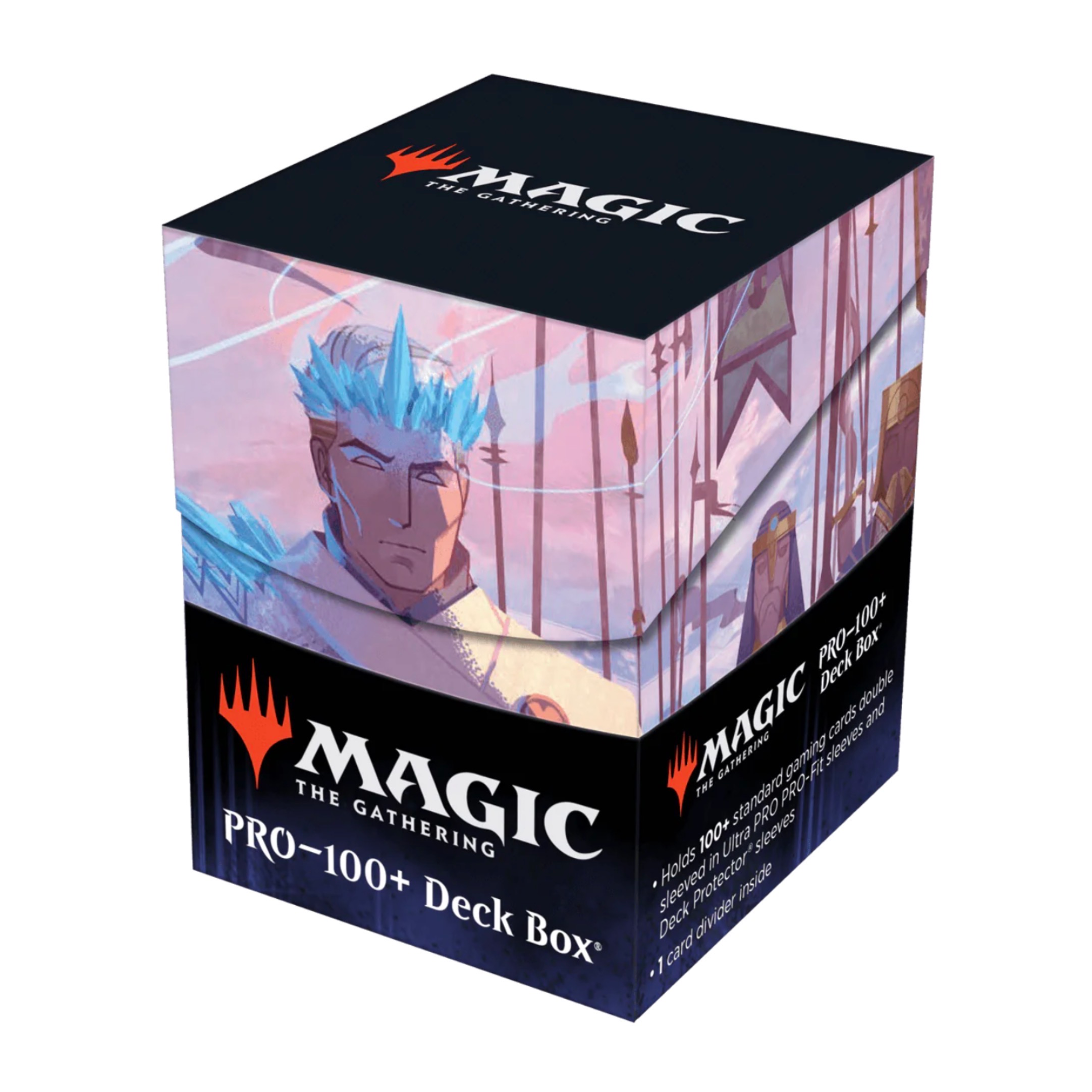 The 100+ Deck Box® card storage container features vibrant, full-color artwork from Magic: The Gathering and includes a deck divider. Made with archival-safe, non-PVC, rigid polypropylene materials, you can store up to 100 double-sleeved cards with confidence. The self-locking lid keeps your cards securely stored when not in use, while also offering easy access. Sized for standard-size trading cards