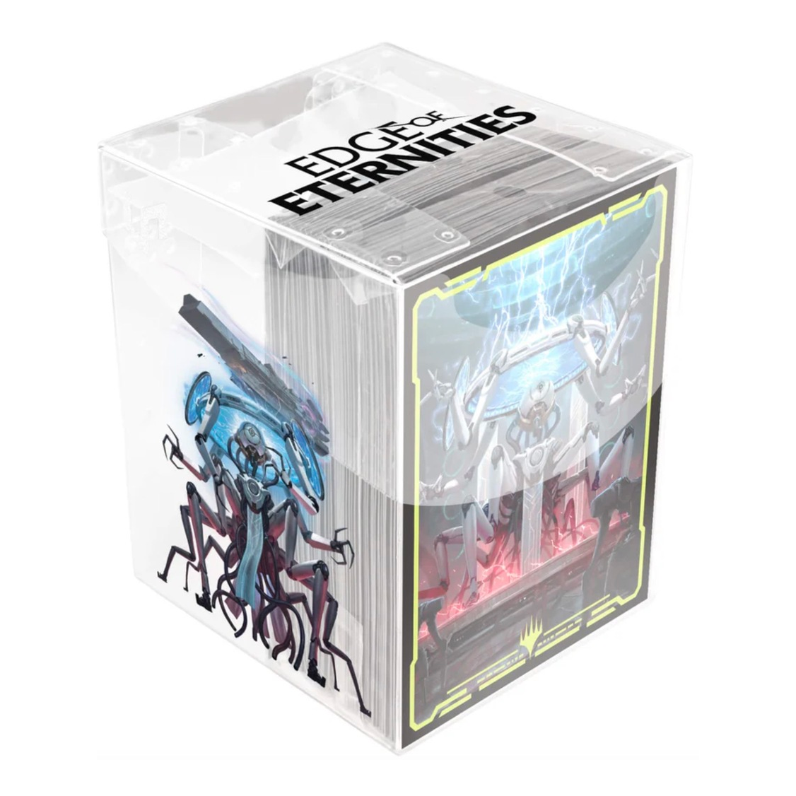 The 100ct Deck Protector Sleeves in Clear Box includes 100 Deck Protector sleeves, a transparent plastic 100+ Deck Box®, and a deck divider, all featuring aligning artwork from Edge of Eternities. The sleeves are made using Ultra PRO’s proprietary ChromaFusion technology to minimize delamination, and the 100+ Deck Box® and divider are made from a clear rigid polypropylene material. All materials are non-PVC and archival-safe to provide premium protection