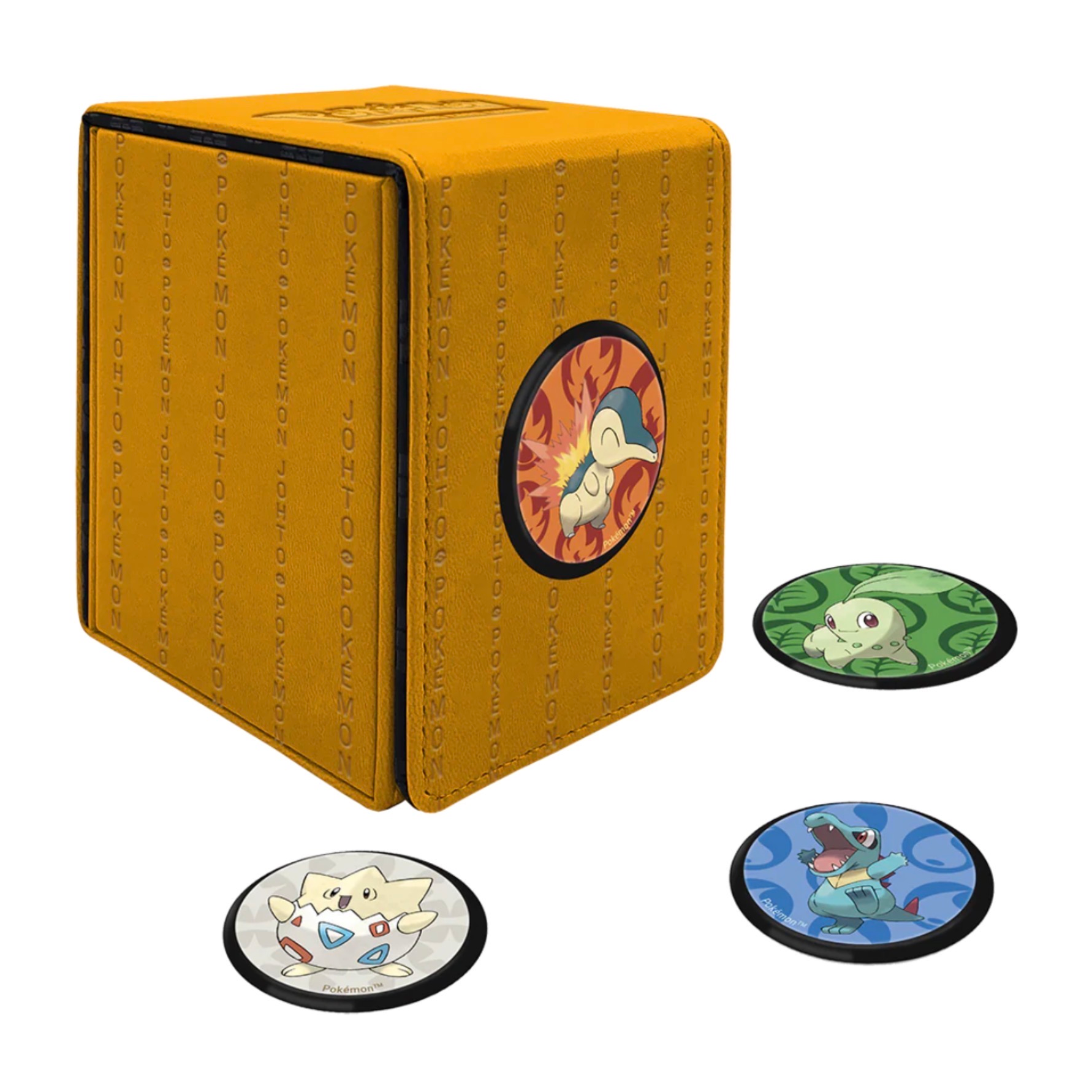 Collect, store, and personalize with the Alcove Click for Pokémon! The Alcove Click comes with four themed badges featuring Cyndaquil, Totodile, Chikorita, and Togepi. This Deck Box holds up to 100 standard size trading cards double-sleeved in Ultra PRO Deck Protector® sleeves, features a strong magnetic closure, and has dual thumb notches for easy access to your deck. Personalize your Alcove Click by popping on your favorite magnetic badges and replacing them with other badges. Badges have a 1.5 in. diameter