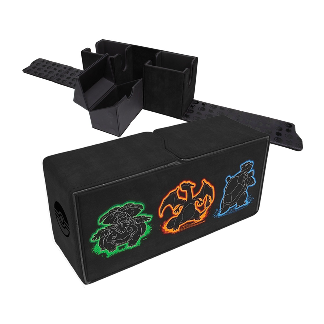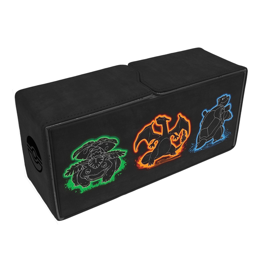 Bring your most powerful decks to the next game night with the Neon Kanto Pokémon Trading Card Game ALCOVE® Vault DECK BOX®! The ALCOVE® Vault’s heavy-duty construction stores and protects up to three separate decks of cards in DECK PROTECTOR® sleeves. Two compartments to the left and right of the ALCOVE® Vault can each hold up to 100 sleeved standard sized (2.5″ x 3.5″) trading card game cards and feature easy-to-access finger notches to easily remove your decks. The center compartment can hold an additional deck or store dice, tokens, counters, and other small gaming accessories. The ALCOVE® Vault’s lids are held secure by powerful magnets, and the entire body is wrapped in premium leatherette material.