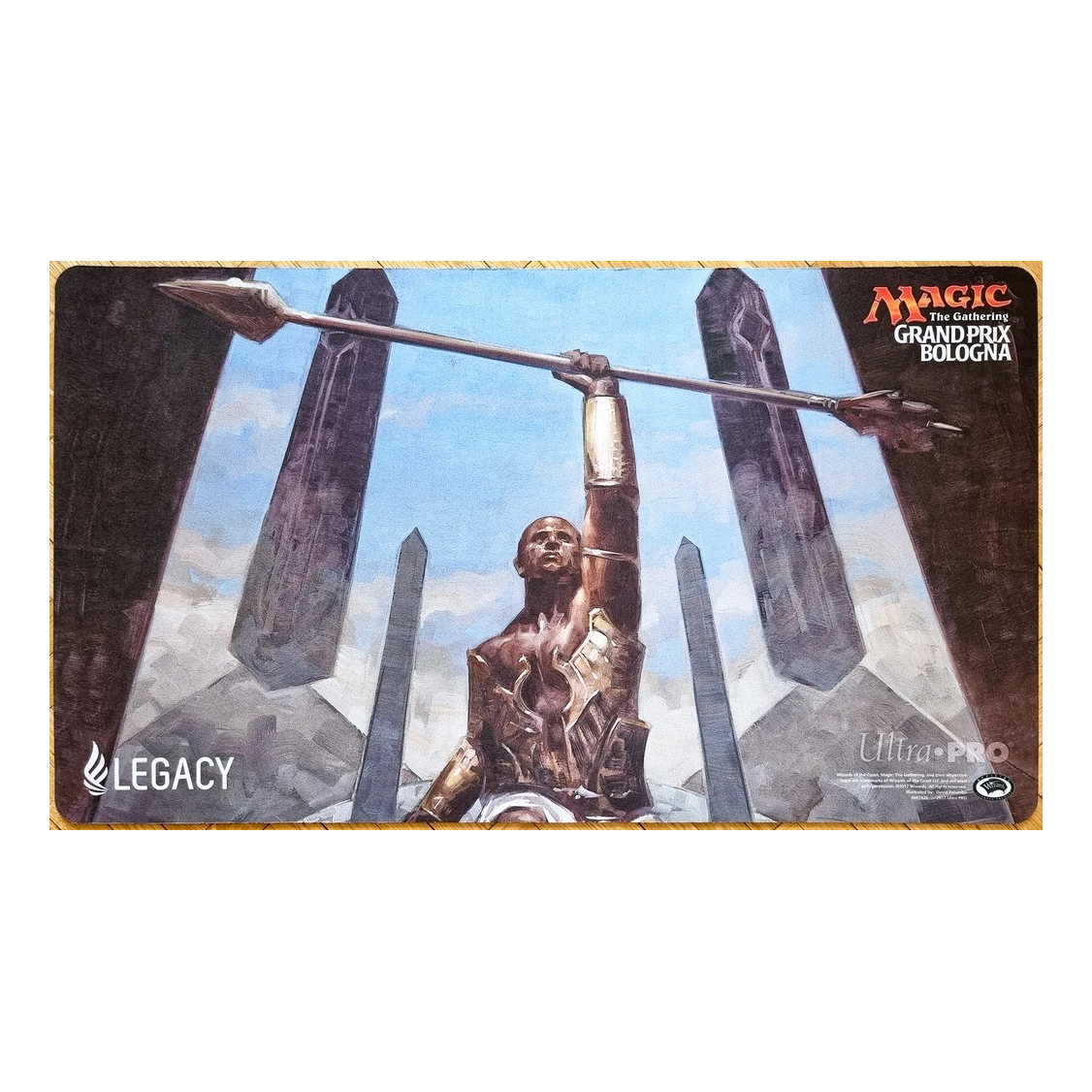 This item is a Magic the Gathering playmat, from the Grand Prix Bologna 2017, featuring the art of Glory-Bound Initiate by David Palumbo originally found in Amonkhet.