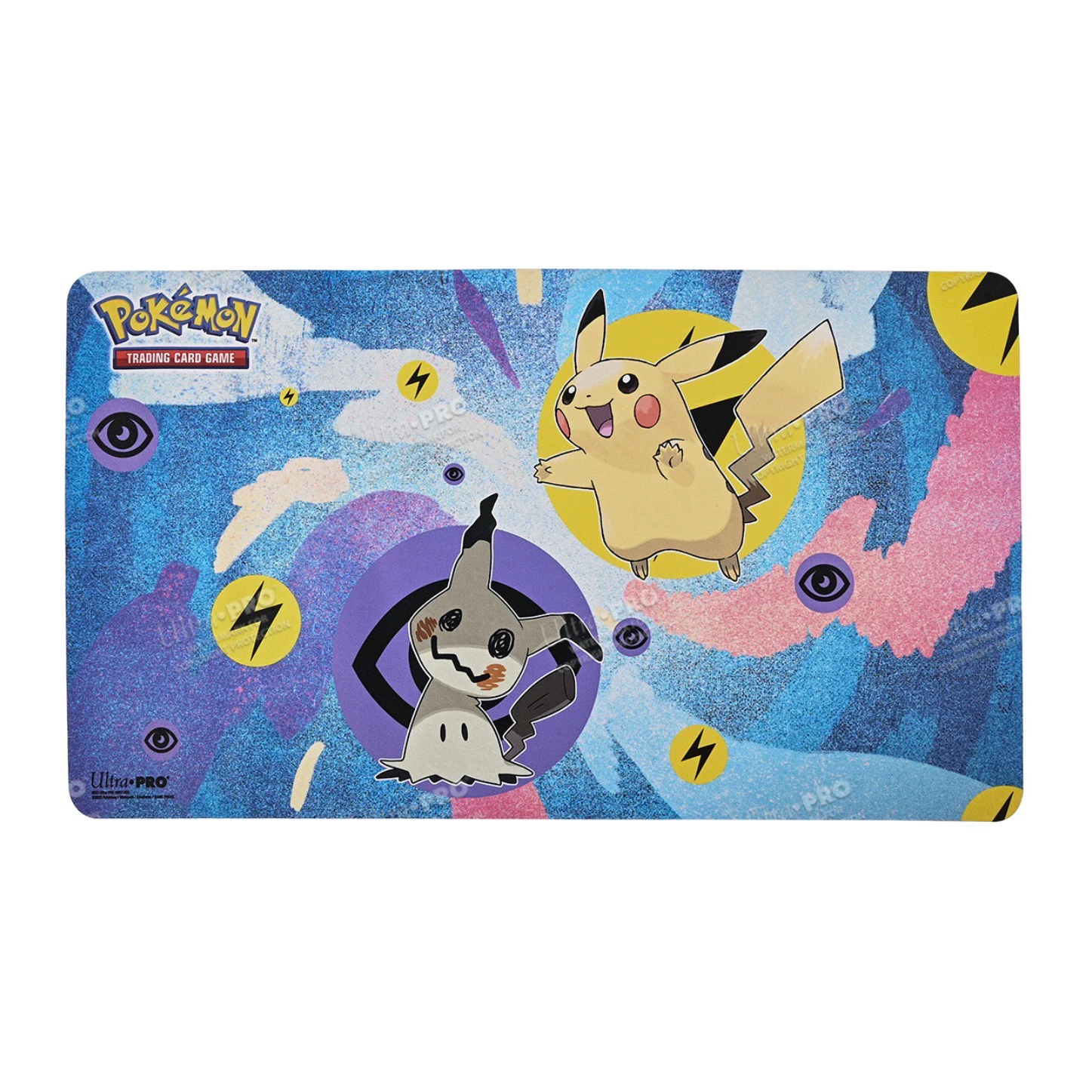 Officially licensed Pokémon Trading Card Game Playmat featuring Pikachu and Mimikyu. Approximately 24 in. x 13.5 in. and lies flat. Soft fabric top helps protect cards during gameplay. Non-slip rubber backing keeps the playmat from shifting during use. Makes an excellent extended or oversize mousepad or desk mat.