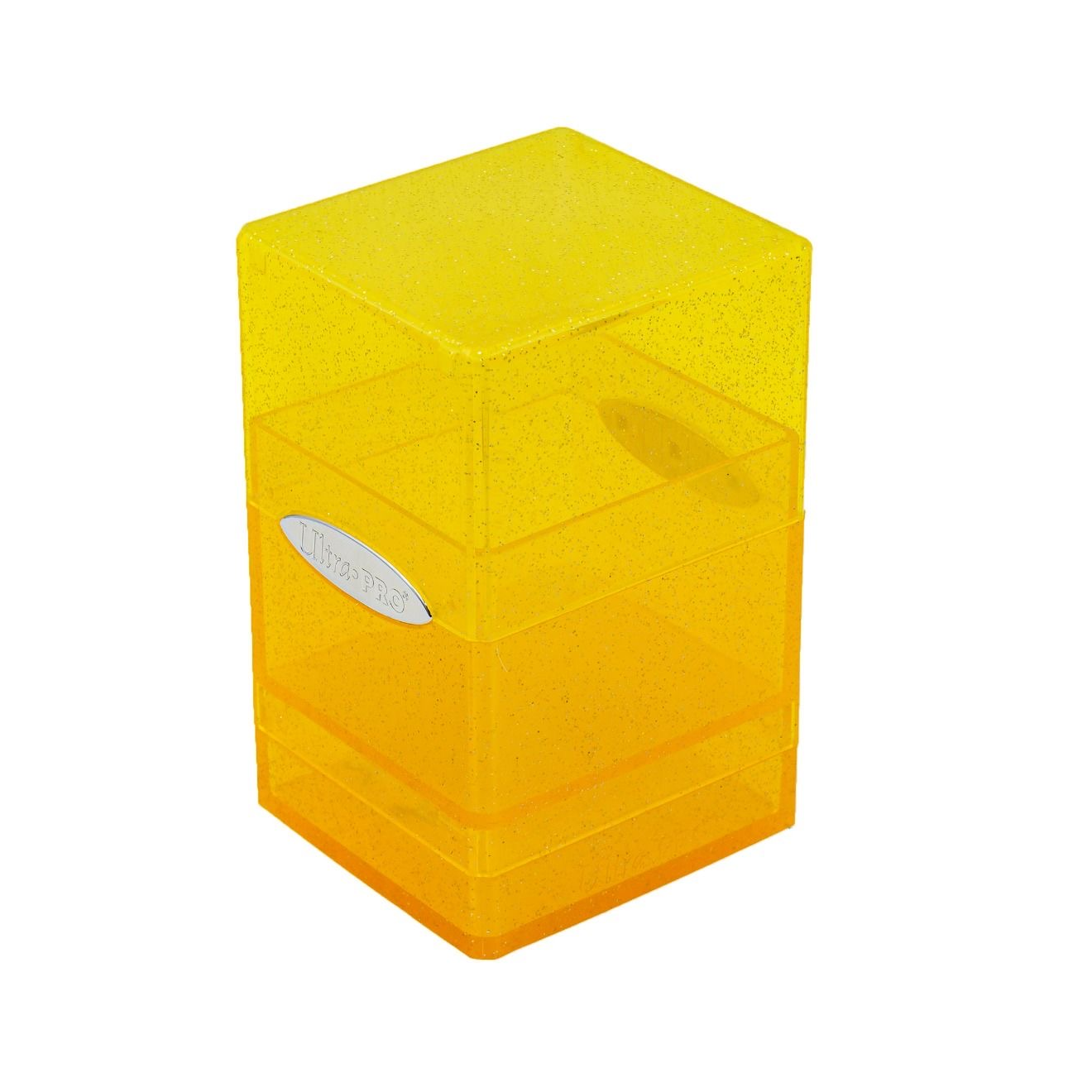 Yellow Satin Tower Deck Box® in a translucent Glitter finish Stores 100+ standard size cards and includes a compartment for dice, coins, or life counters Injection molded plastic design is highly durable for premium protection Snap-fit locking mechanism ensures your cards and components are securely stored Mix and match pieces with any other Satin Tower or Satin Cube