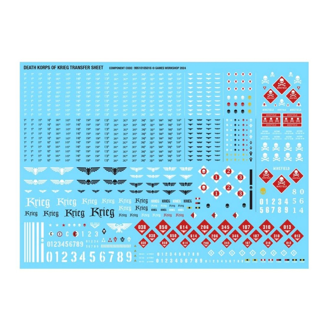 This kit is supplied with 1x Death Korps of Krieg Transfer Sheet, containing 803 high-quality waterslide transfers to decorate your miniatures. There are markings for infantry, vehicles, and artillery, along with squad and regiment numbers, Krieg lettering, and minefield markers.