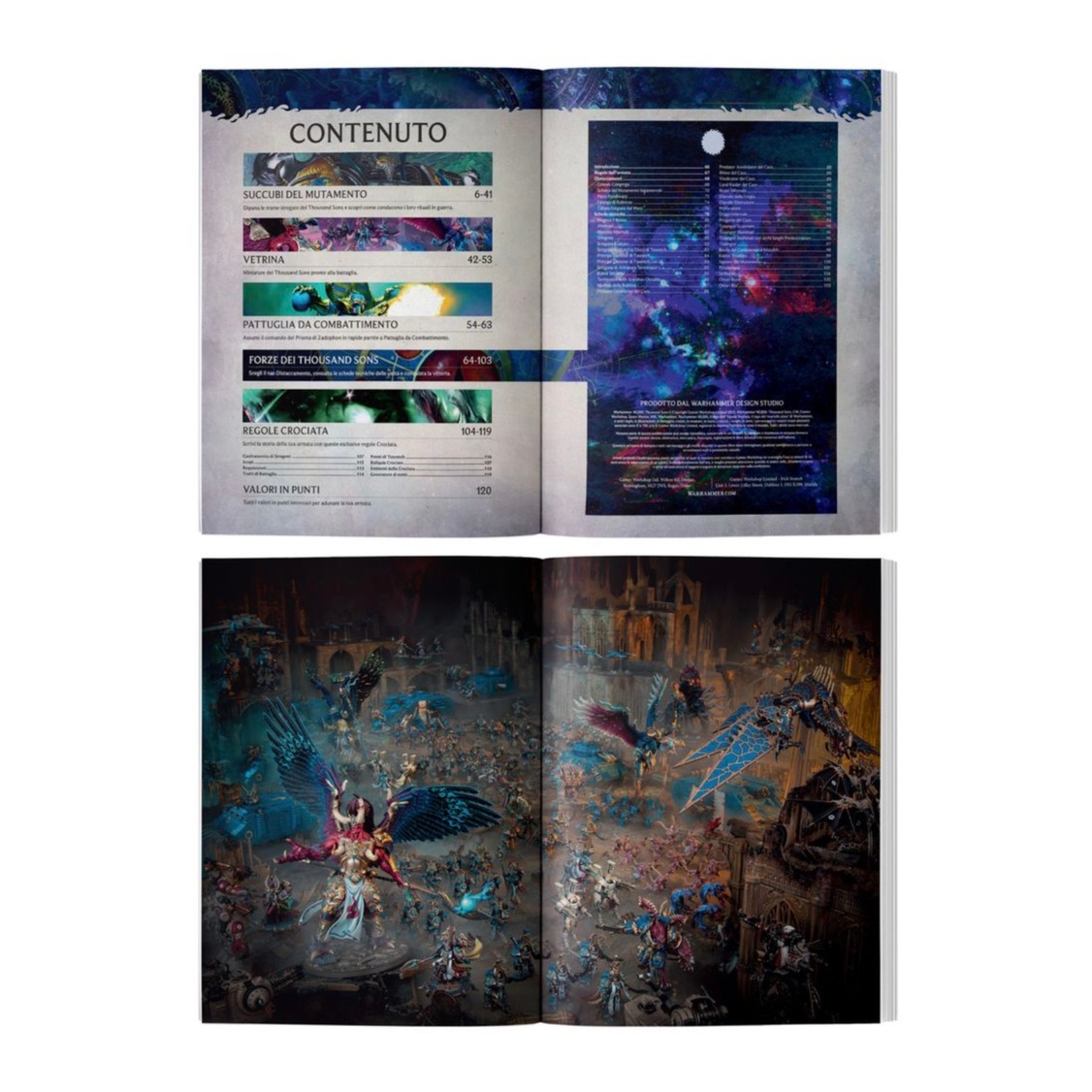 – Regole per utilizzare i Thousand Sons e i Demoni di Tzeentch nelle partite a Warhammer 40,000, con 34 schede tecniche, cinque Distaccamenti e due regole dell’armata