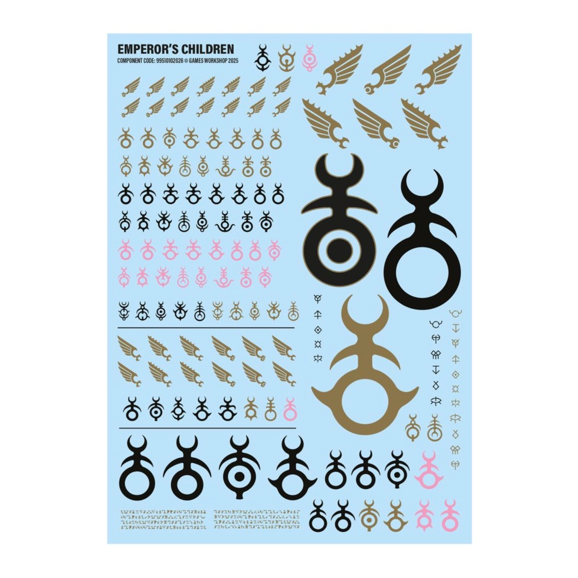 This kit is supplied with 4x Emperor’s Children Transfer Sheets, each containing 150 high-quality waterslide transfers to decorate your miniatures. These include Emperor’s Children symbols in a variety of colours and sizes, plus a selection of twisted Slaaneshi runes and script.