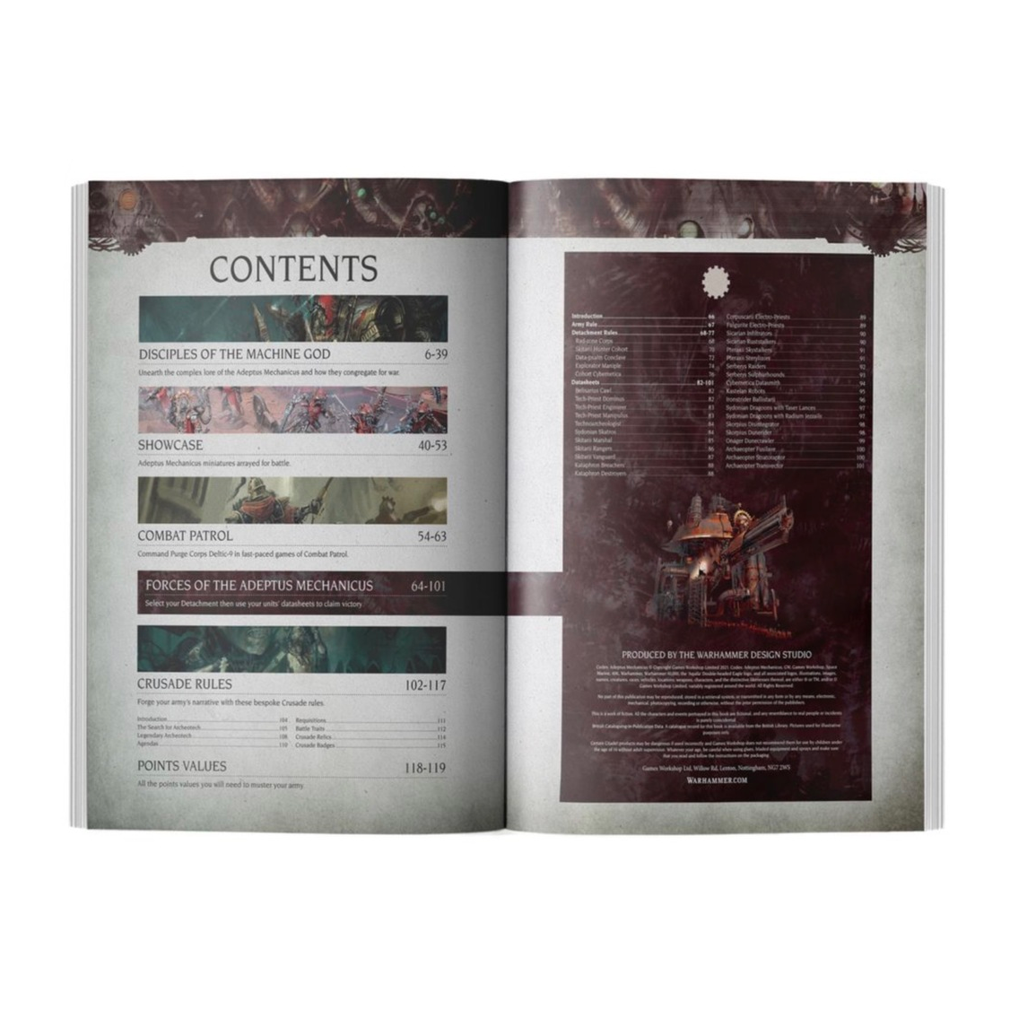 – 30 schede tecniche con i profili, gli equipaggiamenti e le abilità uniche di ogni singola unità dell’Adeptus Mechanicus, dal sinistro Skatros Sydoniano a Belisarius Cawl