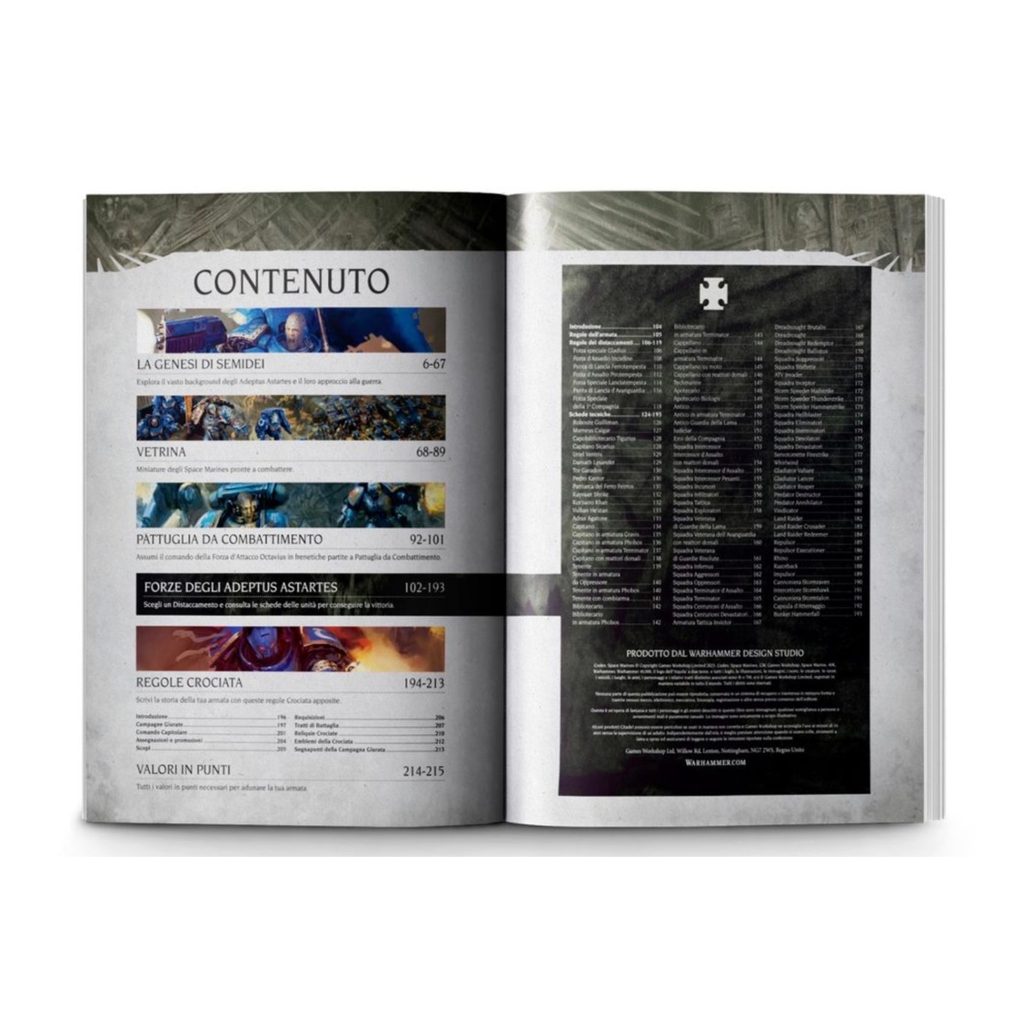 – 93 schede tecniche che descrivono nel dettaglio le regole, gli equipaggiamenti e le abilità uniche di ogni unità di Space Marines, dagli Esploratori freschi di arruolamento ai possenti Dreadnought
