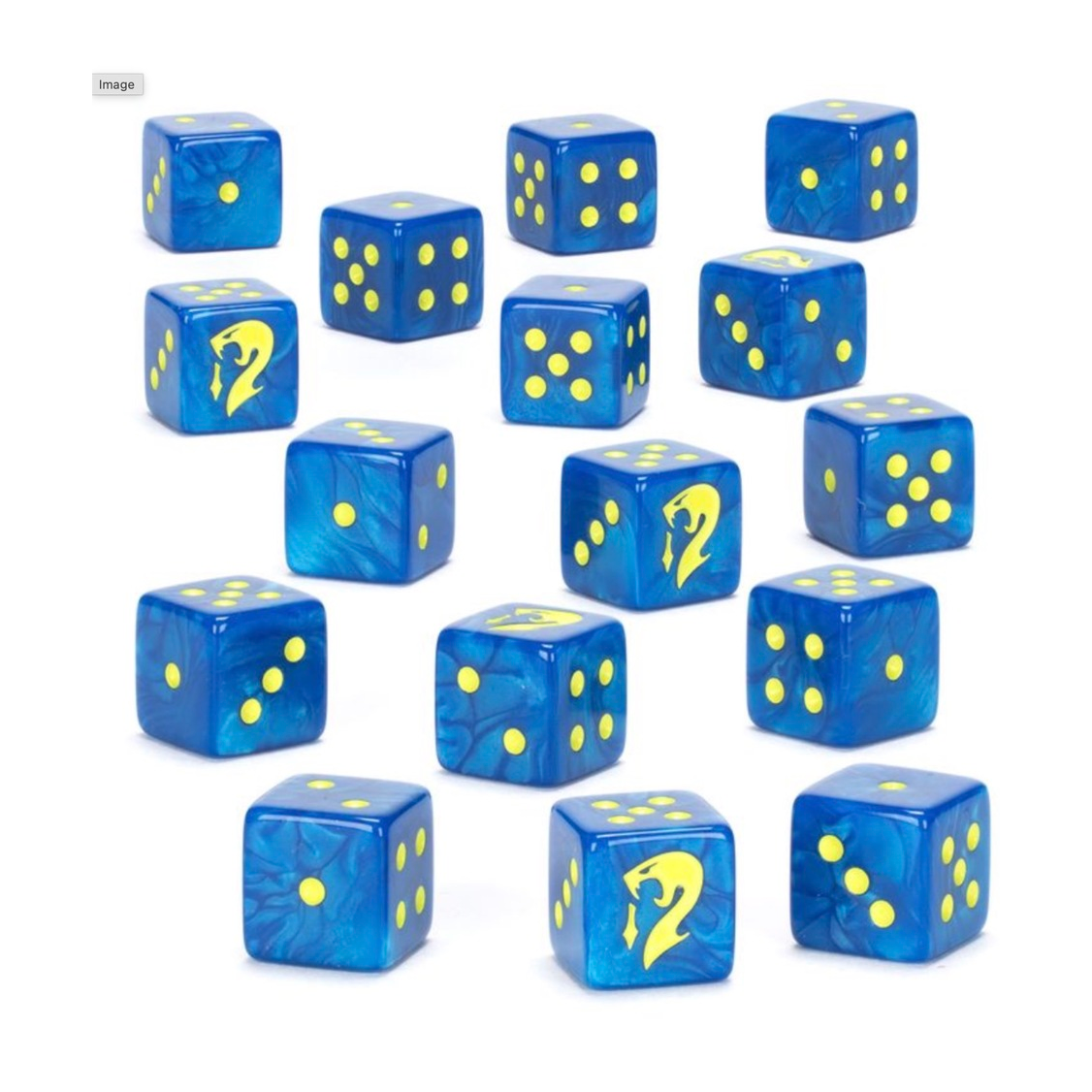 Drukhari who cannot fight and win will soon fall prey to those who can. Masters of misdirection and manipulation, the Kabal of the Poisoned Tongue – led by Aurelia Malys – specialise in outmanoeuvring and out‑thinking their victims. Wherever the Fangs of Malys sink deep, confusion and calamity follow. This is a set of 16 six-sided dice with squared edges for use in games of Warhammer 40,000, themed around the Drukhari. They are cast in pearlised blue acrylic plastic with yellow ink markings, and measure 16mm along each edge. The 1-5 facings are traditionally pipped, and each ‘6’ face is decorated with the Kabal of the Poisoned Tongue icon.