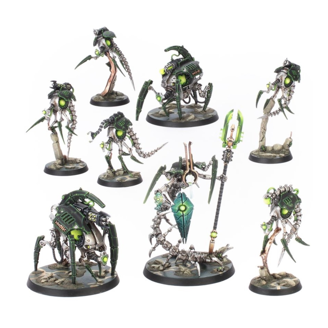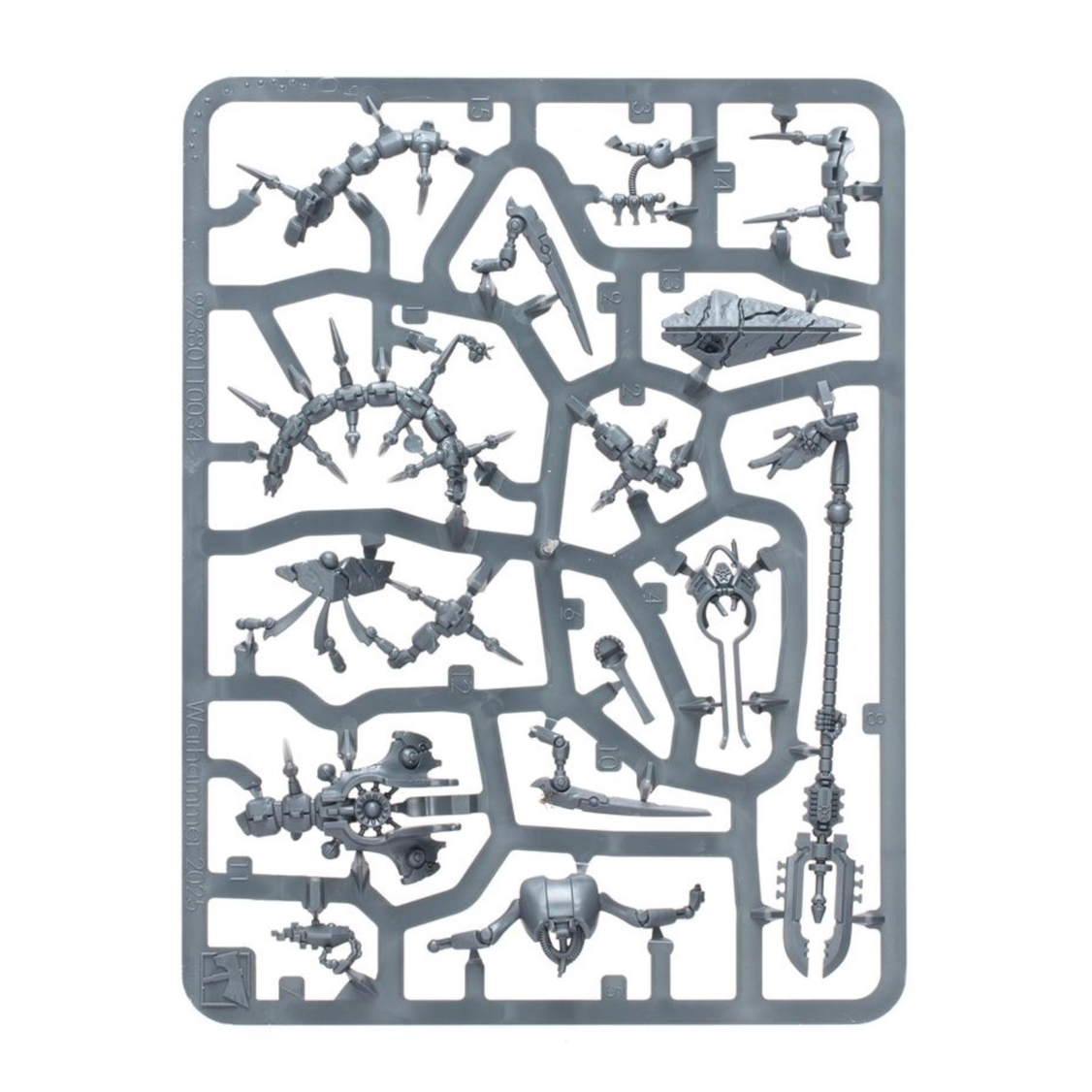 A Canoptek Circle is a unit of sleepless sentinels that defend a Necron Tomb World by tapping into esoteric power matrices to empower their insectile forms. Led by a Cryptek Geomancer, these constructs are extremely difficult to kill, and even when they are seemingly destroyed, they can be quickly repaired and returned to the fight. This multipart plastic kit builds eight Canoptek Circle miniatures. These miniatures can be used as relentless Canoptek Circle operatives in games of Kill Team, or fielded in a Necron army in games of Warhammer 40,000. The kit builds one Geomancer, two Tomb Crawlers, and five Macrocyte Warriors. A choice of weapon options is included in the kit to customise your Tomb Crawlers and Macrocyte Warriors, plus components to build specialists like the empowering Macrocyte Accelerator and repairing Macrocyte Reanimator. Inside the box, you will also find a sheet of 28 double-sided Canoptek Circle tokens, so you can easily keep track of your weapons loadout and in-game effects in the heat of battle. This kit comprises 70 plastic components, 3x Citadel 50mm Round Bases, and 5x Citadel 28.5mm Round Bases. These miniatures require assembly and are supplied unpainted.