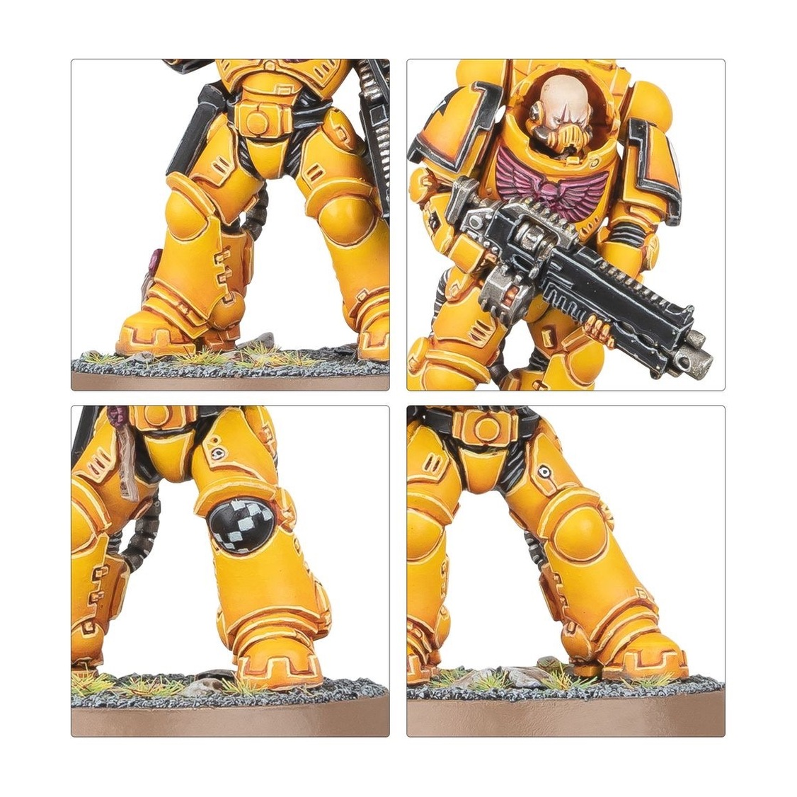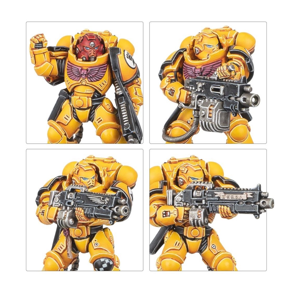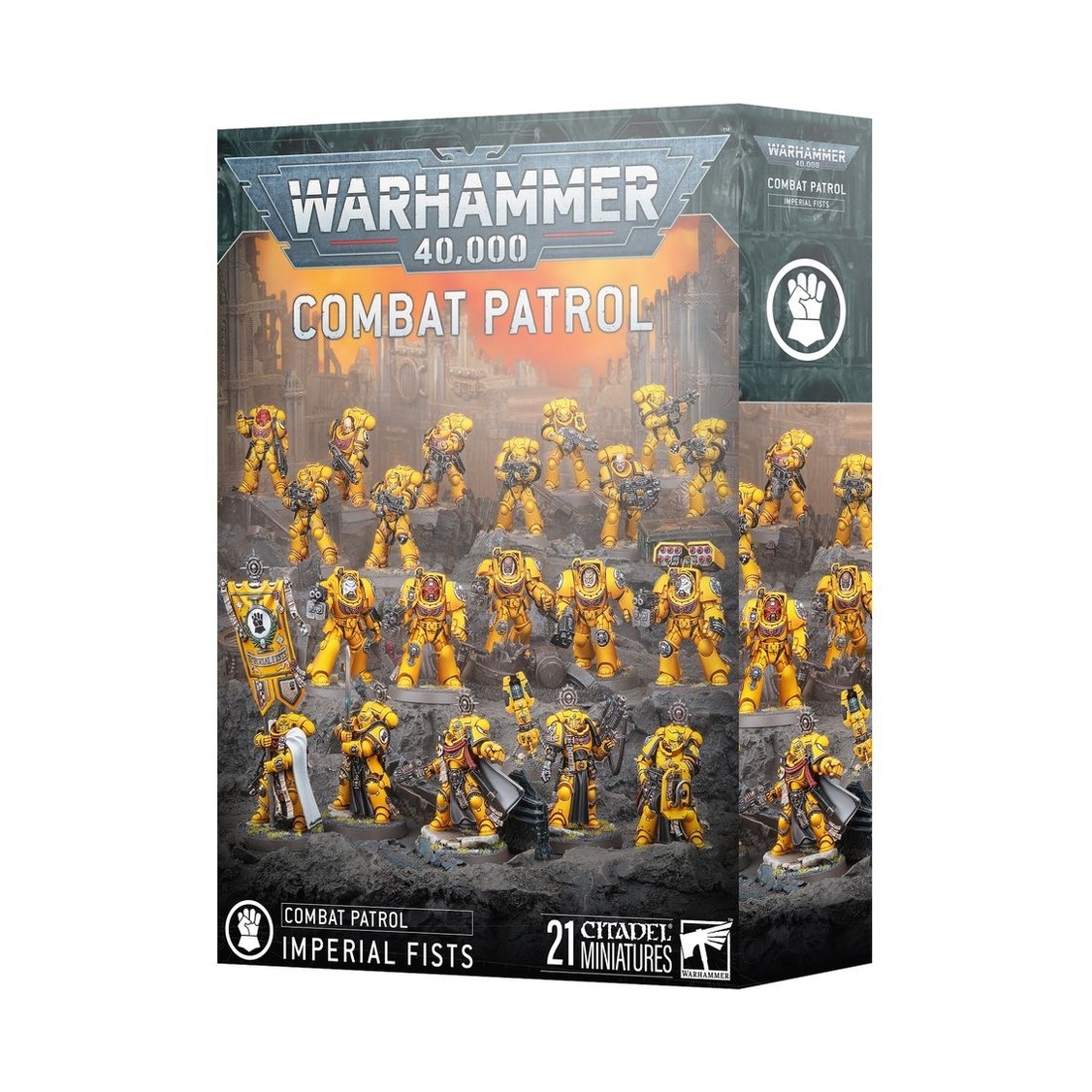 The Imperial Fists are known for their stoic resolve, mastery of siege warfare, and for building impenetrable bastions. They favour heavy armour and efficient gunlines, refusing to give an inch of ground no matter what the enemy throws at them. If you want to stoically defend the Imperium, this box is the perfect way to start a new Imperial Fists collection – or expand an existing army – and save money compared to buying the kits individually. Led by a heroic Captain and his elite squad of Company Heroes, the Heavy Intercessors and Terminators march through any incoming firepower. A Squad of Intercessors clean up any lingering resistance and claim important objectives. These 21 plastic miniatures represent a complete Imperial Fists force for use in tight, tactical Combat Patrol games of Warhammer 40,000. The rules for this Combat Patrol are available as a free download on the Warhammer Community website. This boxed set builds 21 multipart plastic Imperial Fists miniatures: – 5x Company Heroes – 5x Intercessors – 5x Heavy Intercessors – 5x Terminators and 1x Teleport Homer Token – 1x Imperial Fists upgrade frame The miniatures in this box are easy to customise. The Captain has a choice of three heads and can be armed with a master-crafted bolter, plasma pistol, or neo-volkite pistol, and a power fist or power sword. The other members of his Command Squad each have a choice of two different heads. The Intercessors can build an optional Sergeant who can be armed with a power fist. The other squad members have narrative options, including one Space Marine reloading, and another ready to strike with his combat knife. There are also cosmetic options, including interchangeable heads, Imperial Fists moulded shoulder pads, pouches, holsters, purity seals, and more. The Heavy Intercessors can build an optional Sergeant, and one squad member can be armed with a heavy bolter. The kit also includes narrative options, including one Space Marine reloading his heavy bolt rifle, and lots of cosmetic options, including relics, purity seals, pistol holsters, and more. The Terminator Squad can build an optional Sergeant with a choice of power fist, chainfist, or power weapon. Each member of the squad comes with your choice of helmet or bare head, and each can swap out their power fist for a chainfist. One Terminator can be armed with an assault cannon, heavy flamer, or cyclone missile launcher. The storm bolters, power fists, and chainfists are interchangeable across the squad, and there are further cosmetic options, including purity seals, battle honours, and a choice of different tilting plates for the Sergeant. The included Transfer Sheet features the Imperial Fists Chapter icon, markings for battlefield roles, numbers, and scripture. They also include larger decals for vehicles and iconography for Crimson Fists successor Chapter. This kit comprises 483 plastic components, 15x Citadel 40mm Round Bases, 5x Citadel 32mm Round Bases, 1x Citadel 25mm Round Base, and 1x Imperial Fists Transfer Sheet, containing 507 high-quality waterslide transfers. These miniatures require assembly and are supplied unpainted