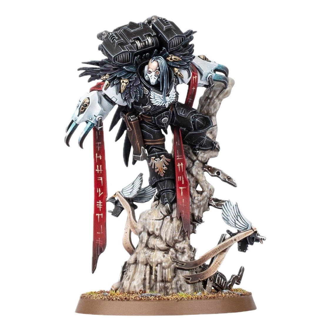 This multipart plastic kit builds Aethon Shaan, the Chapter Master of the Raven Guard, for use in your Space Marines armies in games of Warhammer 40,000. With the mighty Claws of Severax, a heavy bolt pistol, and a custom jump pack, he is able to swoop down and tear into the enemies of the Emperor. Perched heroically as though surveying the battlefield, he is a fantastic miniature for painters, and comes with three different head options – one helmeted, one with a rebreather, and another with a hood.