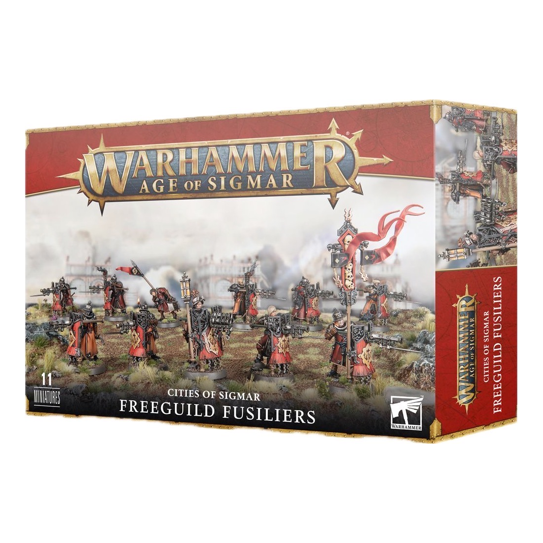 Con questo kit multicomponente di plastica puoi assemblare 10 Fucilieri della Gilda Libera accompagnati da uno Scudiero della Polvere Nera. Ogni Fuciliere trasporta un immenso pavese su cui poggia un fucile-cannone dotato di baionetta. Puoi assemblare un modello come Fucilier Sergente armato con una coppia di pistole o un fucile massacratore a tripla canna, e un altro modello come Fucilier Araldo che sorregge uno stendardo e una torcia con opzioni per icone e fiamme. Lo Scudiero della Polvere Nera che accompagna l’unità corre lungo la linea per fornire proiettili e polvere da sparo ove necessario.