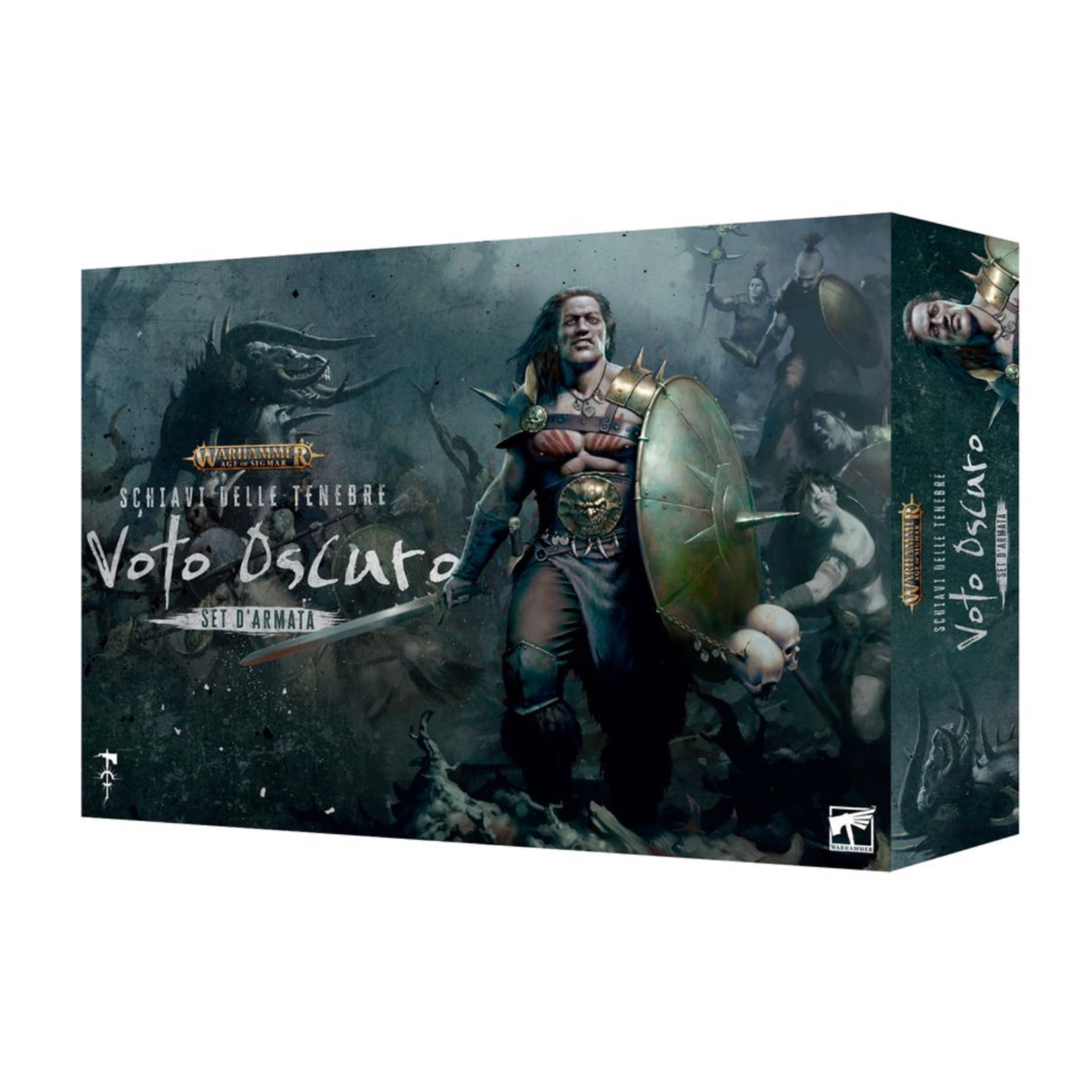 Giungono dalle terre selvagge e intrise di sangue dei Reami Mortali, gli spietati predoni Voto Oscuro. Sono fra i più temuti Schiavi delle Tenebre, spaventose tribù di umani che hanno prestato giuramenti di massacro e carneficina sotto lo sguardo di divinità malevole, e sono disposti a tutto per soddisfarli: se dovessero fallire, le loro anime sarebbero perdute. Discendenti degli sfortunati umani abbandonati da Sigmar quando si è ritirato dietro i Cancelli di Azyr, i Voto Oscuro hanno stretto patti con gli dei della rovina per sopravvivere quando la sopravvivenza era impossibile. Tanto spietati quanto orgogliosi, lanciano incursioni dalle loro terre corrotte dal Caos per soddisfare giuramenti di massacro e vendetta. Le orde corrotte dal Caos di questo set d’armata sono una potente aggiunta per la tua armata degli Schiavi delle Tenebre e un ottimo modo per rinforzare la tua collezione con nuove miniature. Brutali Crudelieri Voto Oscuro cavalcano al fianco di masse di Saccheggiatori Voto Oscuro, guidati dalla prima linea da un selvaggio Capotribù Voto Oscuro su destriero da guerra. Un Diavolo Selvaggio Voto Oscuro supervisiona l’intera tribù come guardiano e carnefice. Un tempo era un campione mortale, ma è stato corrotto e mutato in un abominio ricurvo che anela la carne e imbriglia i poteri della stregoneria primeva. Il set include anche una versione esclusiva stampata del Tomo da Guerra Supplemento: Darkoath, che straripa di regole, background e illustrazioni stupefacenti ed è disponibile in formato fisico solo in questo set d’armata. Dare alle fiamme, saccheggiare e sottomettere i Reami Mortali con la tua collezione sarà ancora più facile grazie all’esclusivo set di carte delle pergamene da guerra e ai segnalini a doppia faccia, entrambi disponibili solo in questo set. Questo set include le seguenti miniature multicomponente di plastica: – 1x Diavolo Selvaggio Voto Oscuro – 1x Capotribù Voto Oscuro su destriero da guerra – 5x Crudelieri Voto Oscuro – 20x Saccheggiatori Voto Oscuro La scatola include anche i seguenti prodotti esclusivi di questo set: – Tomo da Guerra Supplemento: Darkoath – libro di 24 pagine brossurato con regole, background e illustrazioni delle tribù Voto Oscuro – Carte delle Pergamene da Guerra: Voto Oscuro – un set da quattro comode carte che ti aiuteranno a usare le tue miniature nelle partite a Warhammer Age of Sigmar – Foglio di segnalini dei Voto Oscuro – 20 segnalini a doppia faccia esclusivi per tenere traccia dei progressi della tua armata sul tavolo da gioco Tutti i modelli sono forniti con le basette appropriate. Le miniature devono essere assemblate e dipinte