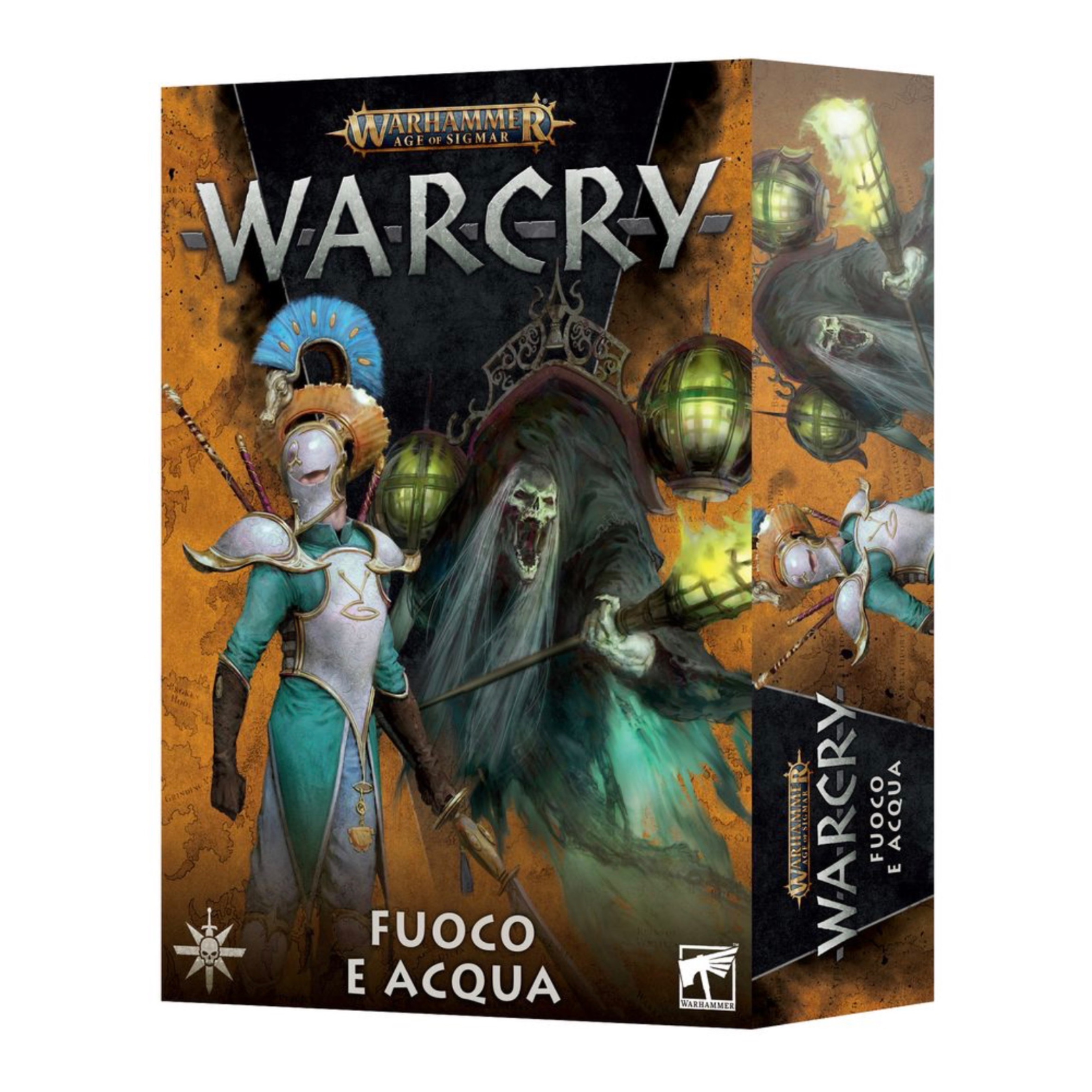 L’esplorazione della Rovina Famelica attira vari tipi di guerrieri nello spaventoso Bosco Nodoso, alla ricerca di gloria, ricchezza o la semplice gioia del massacro. Il sottobosco è talmente saturo di cadaveri che ha attirato gli Abitatori della Notte Fiammantasmi, rischiando così che la foresta venga arsa dall’empio fuoco del Sommo Necromante. La loro diffusione è arginata solo dalle acque di un grande fiume, da tempo dormiente ma lentamente in ripresa grazie alla guida delle Lame di Fiume Ydrilane. Warcry: Fuoco e Acqua continua l’avventura a Bosco Nodoso con due nuove bande da guerra: i Fiammantasmi sparafuoco e i monaci-guerrieri aelfici delle Lame di Fiume Ydrilane. La scatola contiene anche l’Idolo degli Antichi, un enorme elemento di terreno che rappresenta un pezzo di statua crollata, cioè la testa ingioiellata di uno Slann, oltre a un libro della campagna pieno di nuovo materiale di background, regole e illustrazioni. Trovi anche tutte le carte necessarie a usare entrambe le bande da guerra nelle tue partite a Warcry. Questo set in scatola contiene: – Tomo della Banda da Guerra: Fuoco e Acqua di 64 pagine con copertina brossurata. Contiene background, illustrazioni, regole, imprese e campagne per entrambe le bande da guerra della scatola, oltre al nuovo terreno Idolo degli Antichi – Lame di Fiume Ydrilane: 10 aggraziati Lumineth guerrieri al servizio degli aelementor dei fiumi dei regni. Avanzando con rapidità e cipiglio spietato, intendono purificare le terre corrotte. Queste miniature multicomponente di plastica includono 1x Siniscalco Alluvionario, 4x Danzatori delle Rapide e 4x Solcarivi con un assortimento di armi e opzioni cosmetiche. – Fiammantasmi: otto crudeli servitori di Nagash incaricati di liberare le anime intrappolate a Bosco Nodoso appiccando incendi. Queste miniature multicomponente di plastica includono 1x Diacono delle Fiamme, 2x Guardie del Fuoco Arcano, 2x Spettri Ardenti e 3x Spettri Fiaccola con un assortimento di armi e opzioni cosmetiche. – Terreno Idolo degli Antichi: un kit multicomponente di plastica per costruire la testa di una statua crollata raffigurante uno Slann, con aree piatte su cui collocare le miniature durante le partite. – 42x carte piano di battaglia: genera piani di battaglia con rapidità e semplicità con 6x carte terreno, 12x carte schieramento, 12x carte vittoria e 12x carte imprevisto – 20x carte della banda da guerra: fai filare lisce le tue partite con 3x carte abilità per entrambe le bande da guerra e abilità universali, 3x carte divisore per tenere traccia di danni e guerrieri, 7x carte guerriero delle Lame di Fiume Ydrilane e 7x carte guerriero dei Fiammantasmi Warcry: Fuoco e Acqua è un ottimo modo di ampliare la tua collezione di Warcry, aggiungendo due nuove bande da guerra e un imponente elemento scenico abbinato al resto della gamma di rovine dei seraphon. Per usare il contenuto di questa scatola di espansione hai bisogno di una copia di Warcry: Libro Base. Tutte le miniature sono fornite con le basette adeguate. Le miniature devono essere assemblate e dipinte
