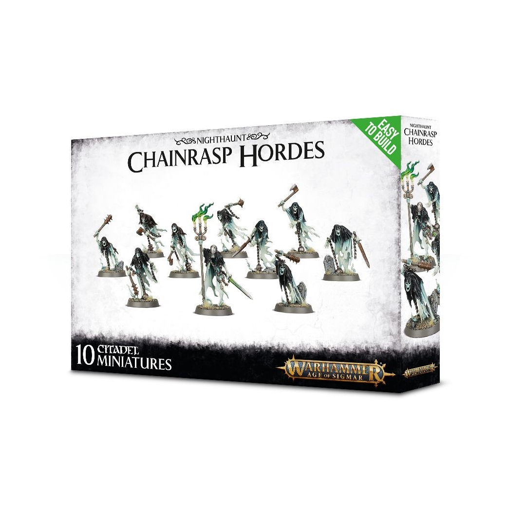 I più numerosi di tutti gli spiriti che si uniscono alle processioni dei Nighthaunts sono le Chainrasp Hordes. Questi fantasmi sono creati dalle anime dei criminali più malvagi e impenitenti ad aver mai vissuto nei Reami Mortali. Sono spettri inferiori, tenuti insieme nella nonmorte solo dal loro sconfinato rancore e dalla follia che li consuma, e queste energie malevole fiaccano la volontà dei nemici. Forse i Chainrasps pensavano che la morte sarebbe stata la fuga da una terribile prigionia ma, in verità, è stata solo l’inizio.