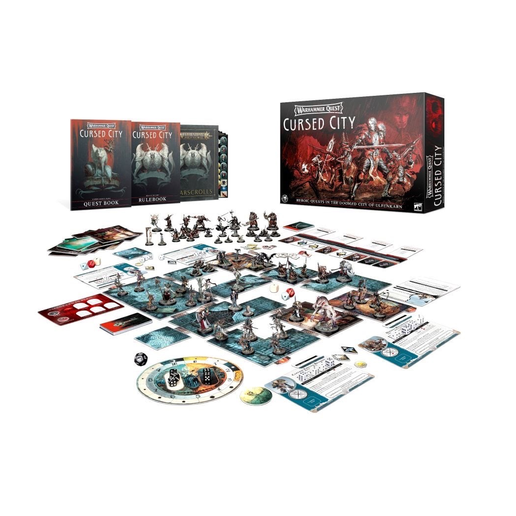 In Warhammer Quest: Cursed City, you and your friends take on the role of a group of disparate heroes seeking fame, treasure, and glory on the streets of Ulfenkarn. Only by working together and balancing your strengths and skills can you hope to survive. With each journey, you will learn more of the Cursed City’s closely guarded secrets and encounter more of the murderous undead that haunt it… Each trip into the Cursed City is a race against time, as the forces of Radukar the Wolf become empowered when night falls. At the end of every journey into Ulfenkarn, the players are retrieved by the airship Adamant, so that they may heal, gain experience, and make their plans for the future. Only experienced heroes with the best weapons can hope to overcome Radukar and free Ulfenkarn from its undead curse – do you have what it takes to save the Cursed City?