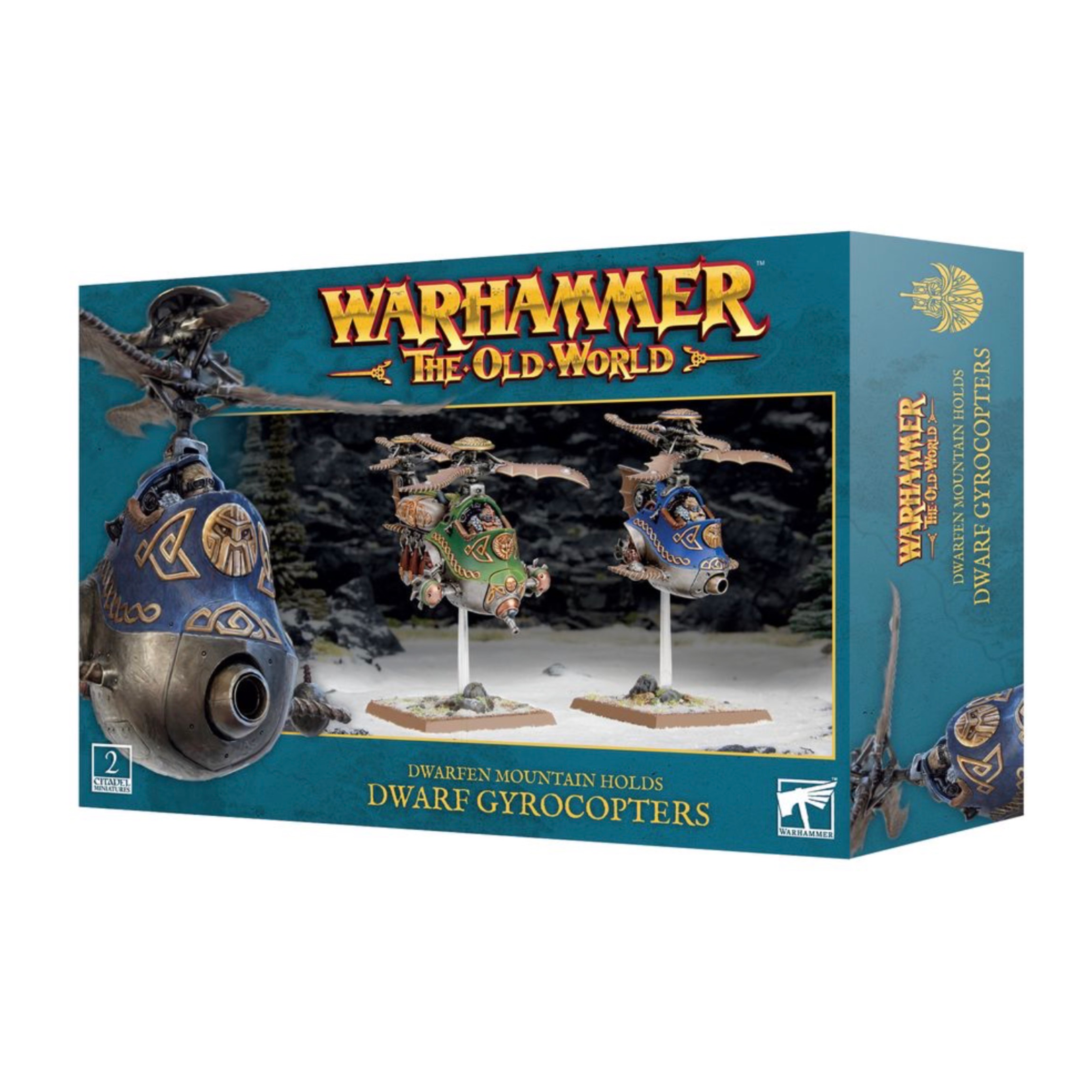 Gyrocopters are flying machines whose rotor blades are propelled by an ingenious lightweight steam engine. Having proven their effectiveness across many battlefields of the Old World, even smaller dwarf strongholds have an airborne fleet. When more firepower is required, Gyrobombers, armed with multiple rows of devastating bombs and potent nose-mounted guns, stream over the Dwarf battle lines, seeking to obliterate their foes. This multipart plastic kit builds two Dwarf Gyrocopters, airborne battle-contraptions from the Dwarfen Mountain Holds. This awesome kit comes with a choice of four different pilot heads and four different Dwarf icons for personalising your flying machines. Each Gyrocopter can instead be built as a bomb-laden Gyrobomber, and both aircraft can be armed with a brimstone gun, clattergun, or steam gun jutting from their prows. This kit contains 134 plastic components, 2x Citadel 50mm Square Bases, and 2x Flying Stems. Also included is 1x Dwarfen Mountain Holds transfer sheet, containing 342 high-quality waterslide transfers for you to decorate your army. These miniatures are supplied unassembled and unpainted.
