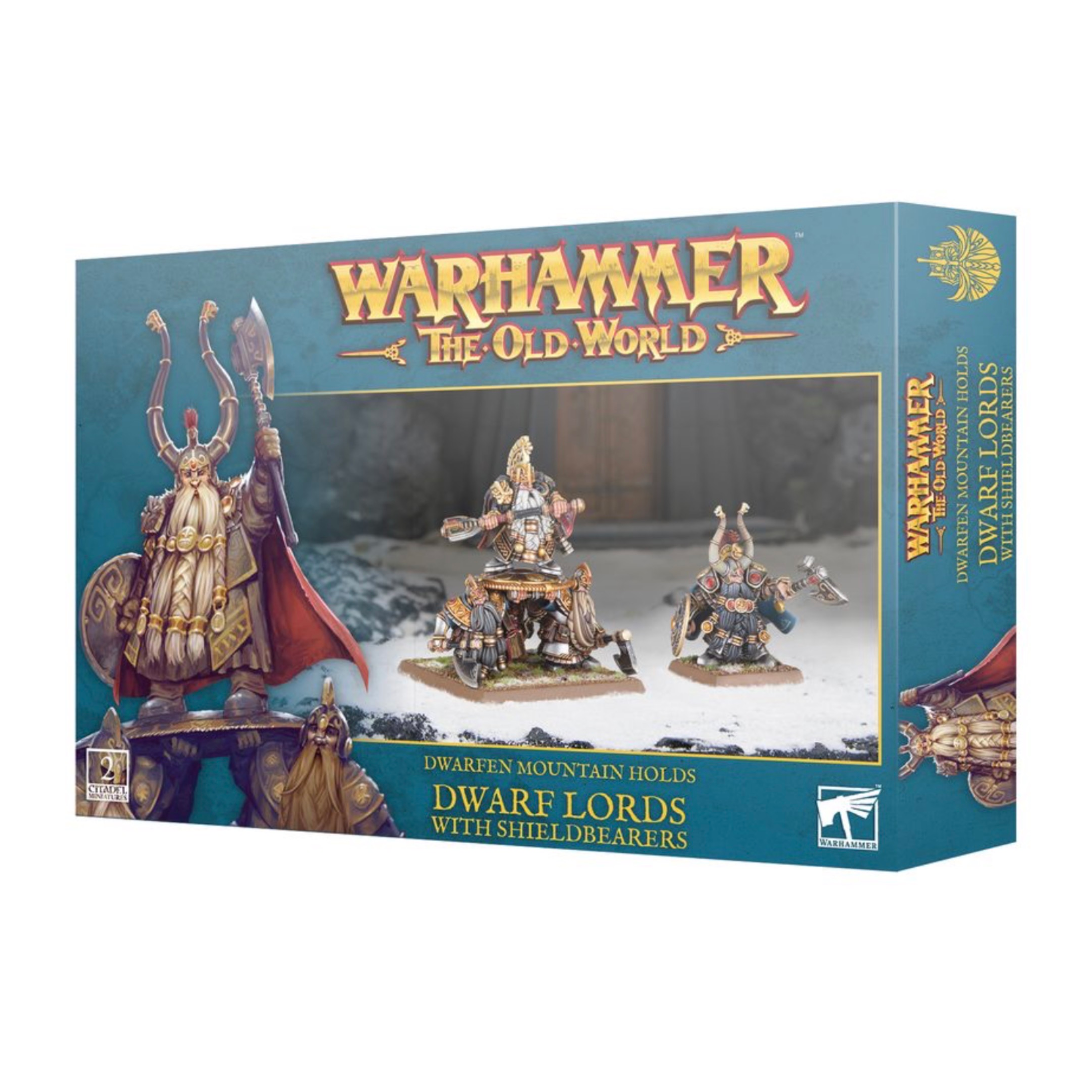 Dwarf Lords are warriors with vast experience of battle who have been tutored in the art of war by the elders of their clans. When the time comes for them to lead, they will have learnt more than most commanders ever know and will have been tried and tested on the battlefield many times. Some lords are carried into battle by Shieldbearers – stout warriors who heft a shield to serve their liege as a fighting platform. This multipart plastic kit builds two Dwarf Lords – one carried aloft by Shieldbearers, the other marching into battle on foot – to lead the armies of the Dwarfen Mountain Holds. The kit includes two bearded heads, two ornate helmet crests, and two armoured bodies, which can be swapped together in any combination to customise your mighty leaders – either of which can be posed atop the accompanying Shieldbearers. You’ll also find weapon options to build one Dwarf Lord with an axe and shield, and the other with a great weapon, plus an optional holstered pistol and a grim ancestral badge. This kit comprises 50 plastic components, and comes with a Citadel 50mm Square Base and a Citadel 25mm Square Base. These miniatures are supplied unpainted and require assembly.