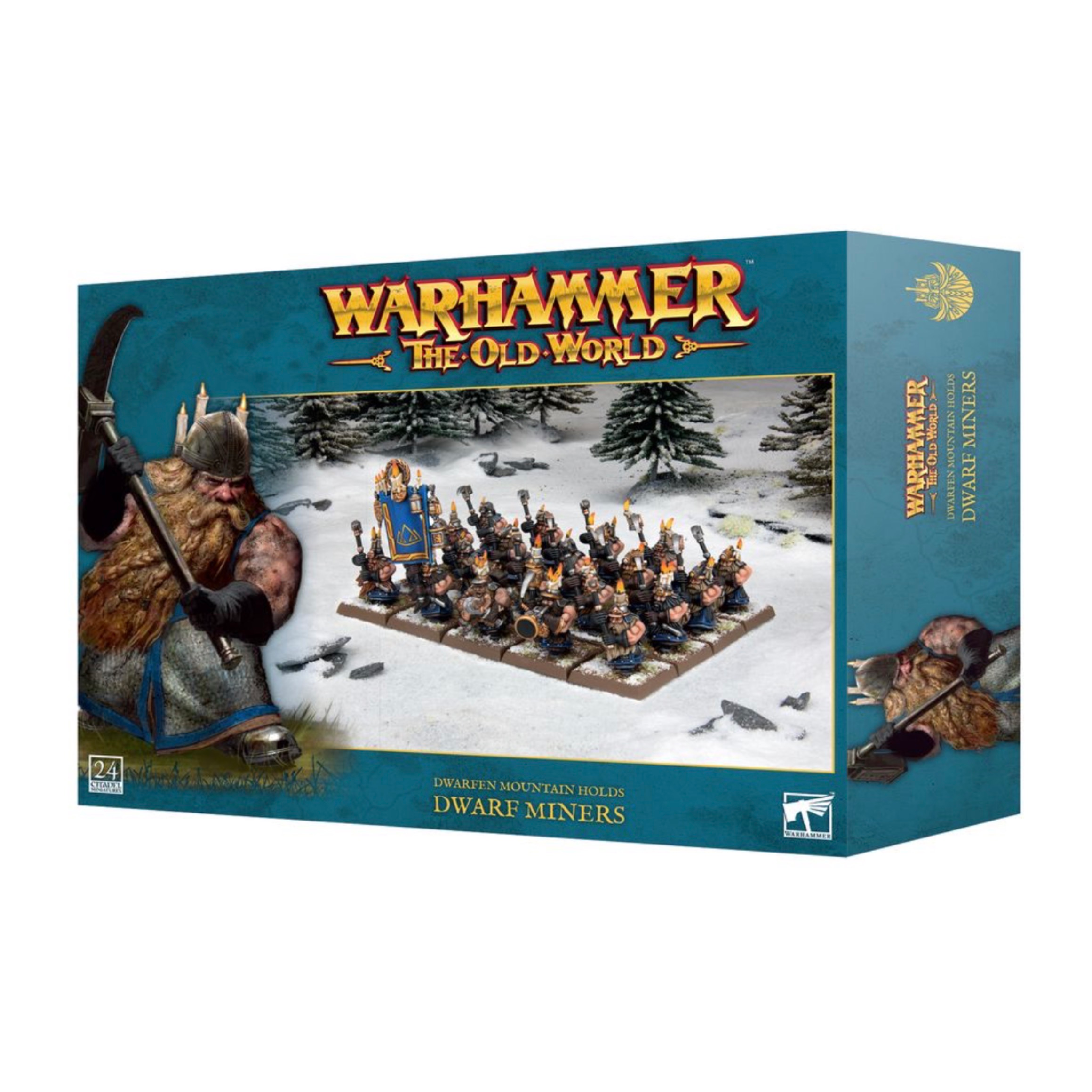 Dwarf Miners often join their brethren when they march to war. As a point of pride, they wield the same heavy, two-handed mining picks and mattocks they use to carve out tunnels, rather than the axes and hammers typically favoured by other Dwarfs. They are accompanied into battle by sturdy wooden carts drawn by rugged draft ponies to ensure they are properly equipped to face the trials that await them. This multipart plastic kit builds 20 Dwarf Miners and four Miner’s Carts, tunnelling fighters from the Dwarfen Mountain Holds. Each of these doughty excavators is clad in heavy chainmail and carries a mining pick to crack open enemy armour. This kit also provides all the command upgrades you’ll need, whether you choose to field your Dwarf Miners in small groups or as one large host – you can build musicians, champions who can optionally be armed with a steam drill, and standard bearers with a choice of icon or banner. The rugged Miner’s Carts are drawn by sturdy ponies, which can be mounted with optional drills of their own. This kit contains 248 plastic components, 20x Citadel 25mm Square Bases, and 4x Citadel 50mm x 75mm Rectangular Bases. Also included is 1x Dwarfen Mountain Holds transfer sheet, containing 342 high-quality waterslide transfers for you to decorate your army. These miniatures are supplied unassembled and unpainted.