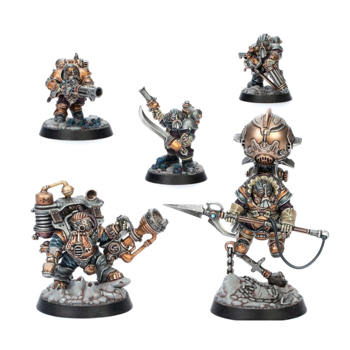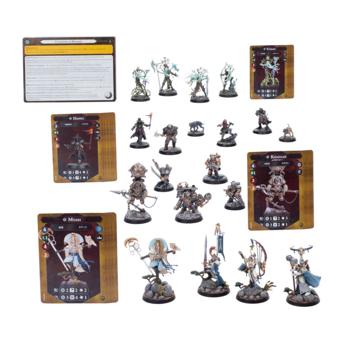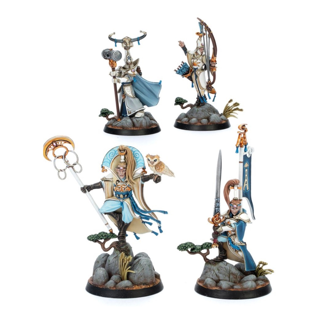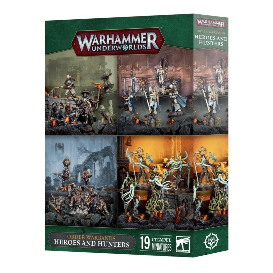 Across the Mortal Realms, the forces of Order seek to hold back the tides of Destruction, Chaos, and Death. Small forces can be found beneath the ruins of Embergard, keeping sacred relics and powerful artefacts out of enemy hands, and restoring light and truth. This kit bundles four Order-themed warbands for Warhammer Underworlds. All the miniatures are push-fit, moulded in coloured plastic, and include scenic bases on the frames so you can start playing quickly. You’ll also find warscroll cards and fighter cards for each warband. Hexbane’s Hunters and Ylthari’s Guardians are both aggressive Strike warbands, Myari’s Purifiers are a versatile Flex warband, and Thundrik’s Profiteers feature the Mastery playstyle which rewards players for careful management. This set includes the following 19 miniatures: – 6x Hexbane’s Hunters – Haskel, Aemos, Brydget, Pock, Ratspike, and Grotbiter – 4x Ylthari’s Guardians – Ylthari, Ahnslaine, Skhathael, and Gallanghann – 5x Thundrik’s Profiteers – Thundrik, Lund, Enrik, Garodd, and Khazgan – 4x Myari’s Purifiers – Myari, Bahannar, Ailenn, and Senaela The box also includes: – 19x double-sided fighter cards – 16x double-sided warscroll cards (in English, French, German, Spanish, Italian, Chinese, and Japanese) The double-sided fighter cards measure 63mm x 88mm, and the double-sided warscroll cards measure 106mm x 145mm. This kit contains 114 plastic components, including integrated scenic bases. These push-fit miniatures can be assembled without glue and are supplied unpainted