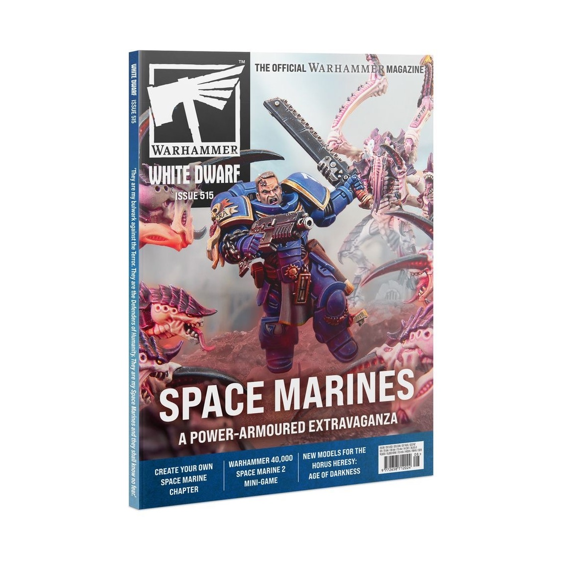 Each copy of White Dwarf 515 also comes with a cardboard insert containing a double-sided card featuring the scenarios of the month for Warhammer 40,000 and Warhammer Age of Sigmar, a Space Marines Transfer Sheet containing 442x transfers, an A2 poster featuring Space Marine Armour Marks on one side and Warhammer 40,000: Mechanicus II on the other, and 8x double-sided cards for the Space Marine Operations mini-game.