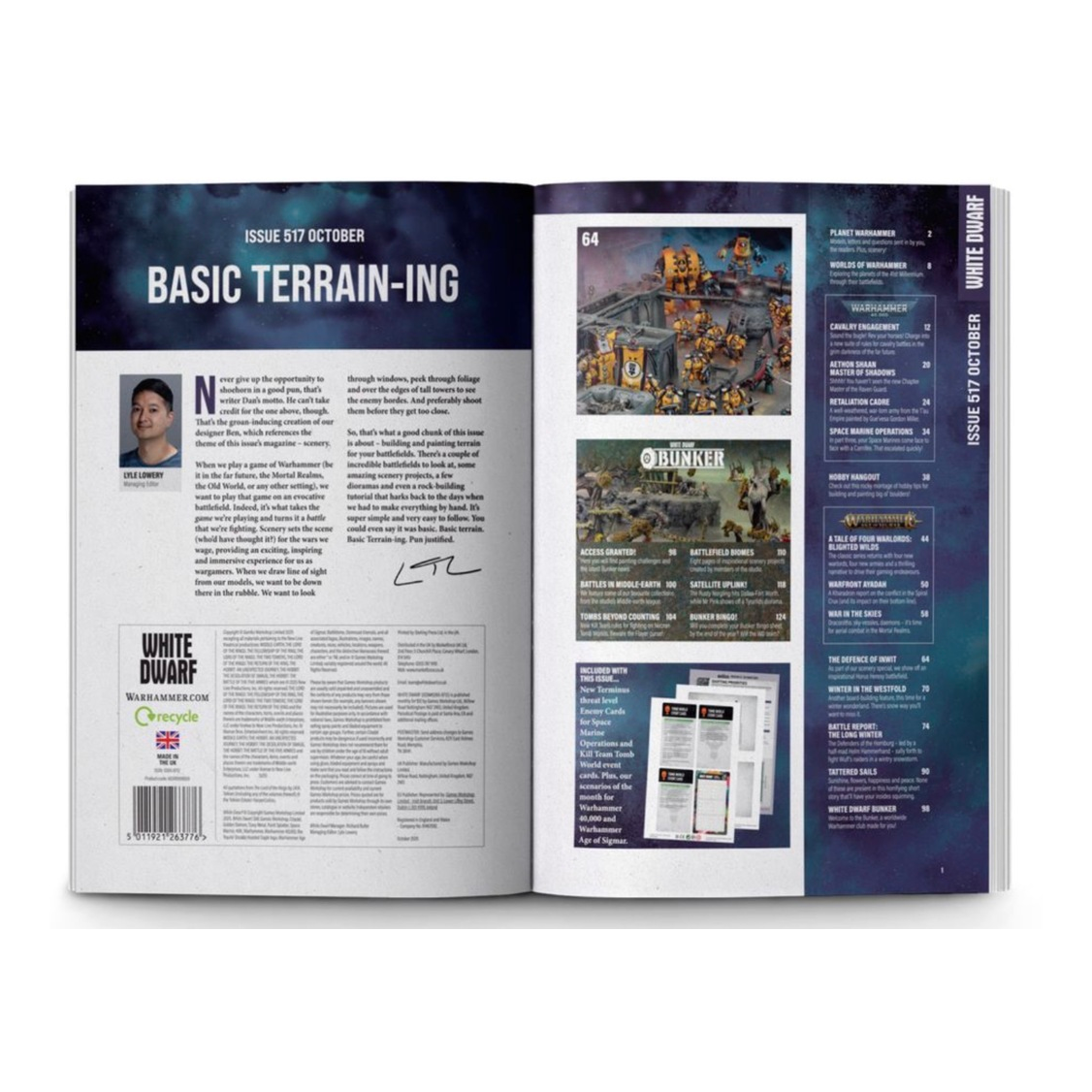 Each copy of White Dwarf 517 also comes with a cardboard insert containing the scenarios of the month for Warhammer 40,000 and Warhammer Age of Sigmar, Terminus threat Level Enemy cards for the Space Marine Operations mini-game, and Kill Team: Tomb World event cards are also included.