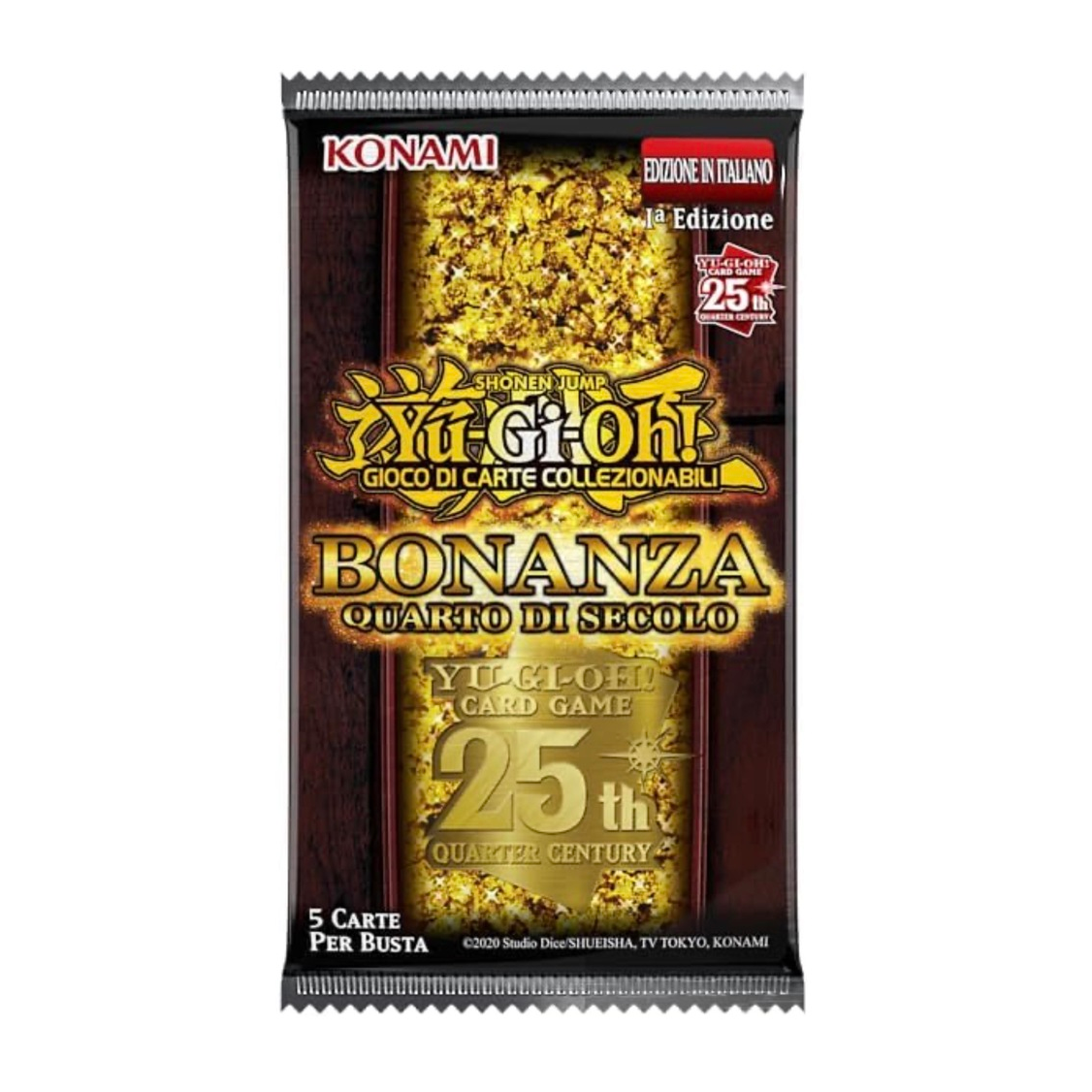 Tutte le buste Bonanza Quarto di Secolo contengono 5 carte, fra cui la prima Collezione Rarità. Però abbiamo sostituito 1 Super Rara in ogni busta con una Rara Segreta Sfarzosa GARANTITA (Platino o Quarto di Secolo).