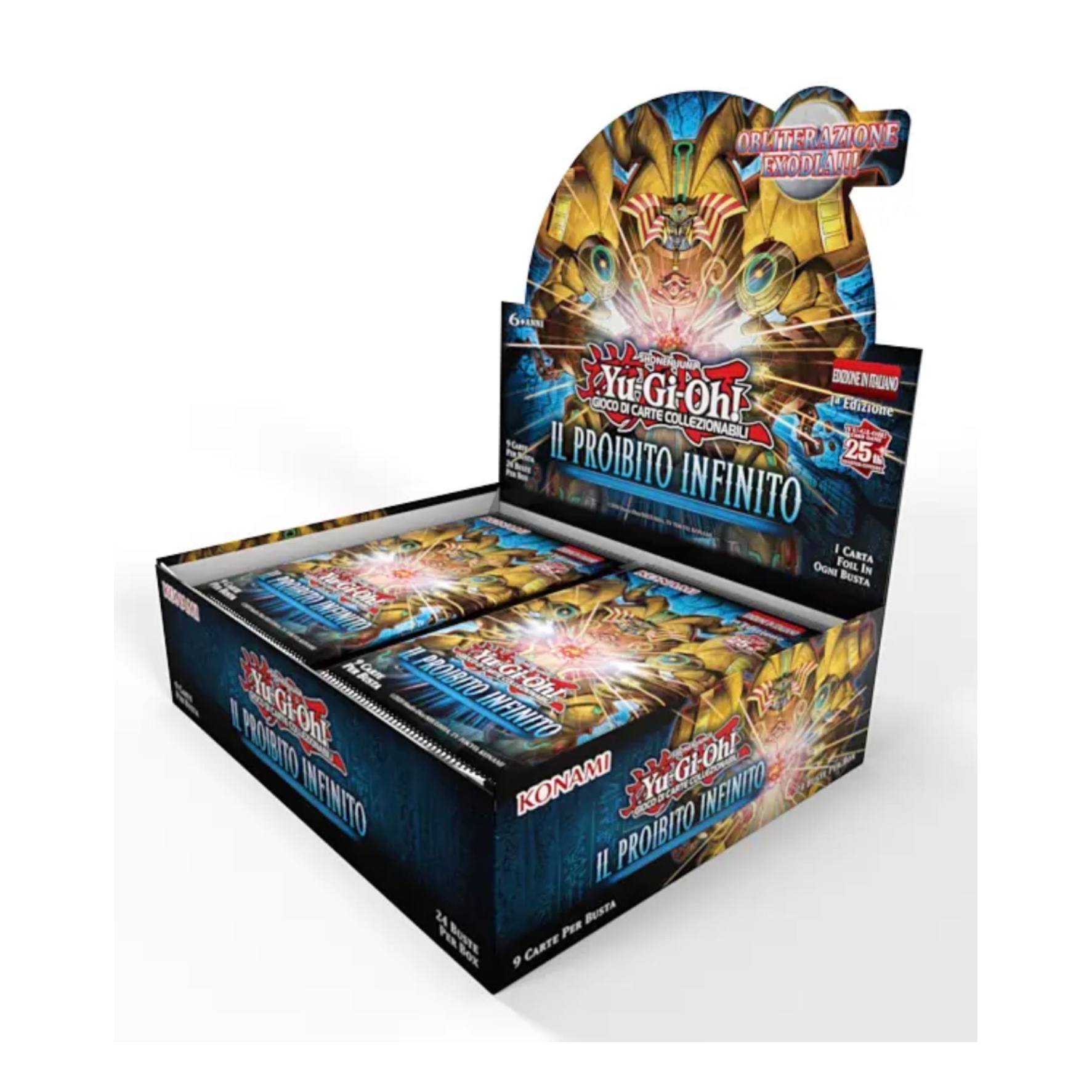 Il Proibito Infinito include 100 carte, nuove e vecchie, per una varietà di strategie, incluso un nuovissimo tema in Anteprima Mondiale! In più, porta avanti il divertimento del festeggiamento del 25° anniversario con ben 25 Rare Segrete Quarto di Secolo, tra cui 1 carta speciale.
